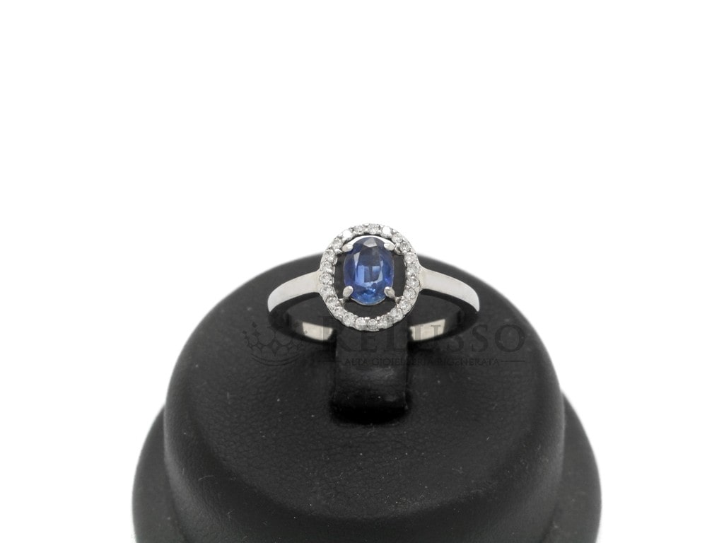 Anello in oro bianco 18kt con al centro uno zaffiro taglio ovale composito dal peso stimato di 0,50ct contornato da 22 diamanti taglio brillante rotondo dal peso complessivo stimato di 0,10ct.