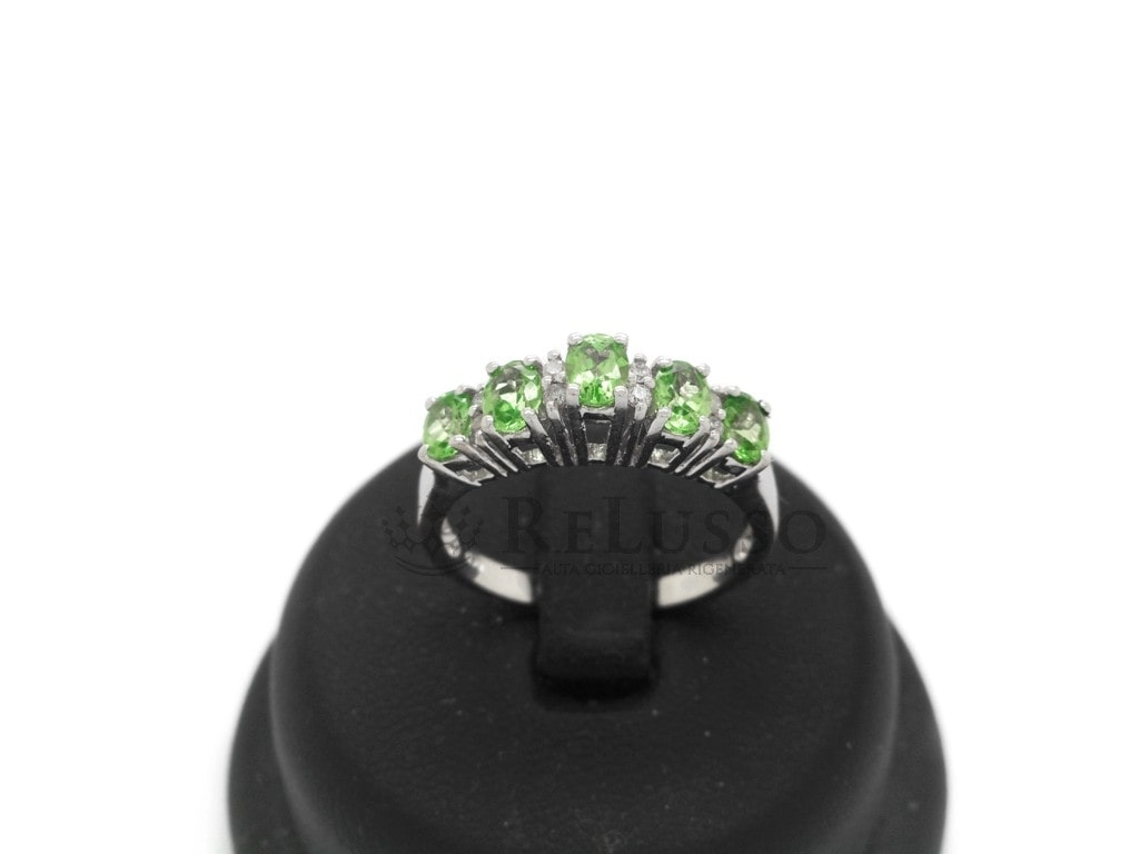 Anello riviera in oro bianco 585 (14 kt) con cinque tsavoriti taglio ovale per un peso complessivo stimato di 1,00ct alternate con otto piccoli diamanti dal peso complessivo stimato di 0,05ct.