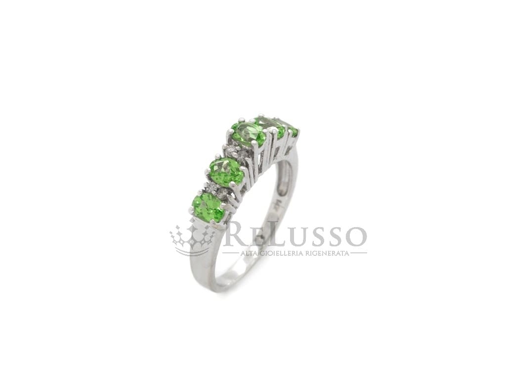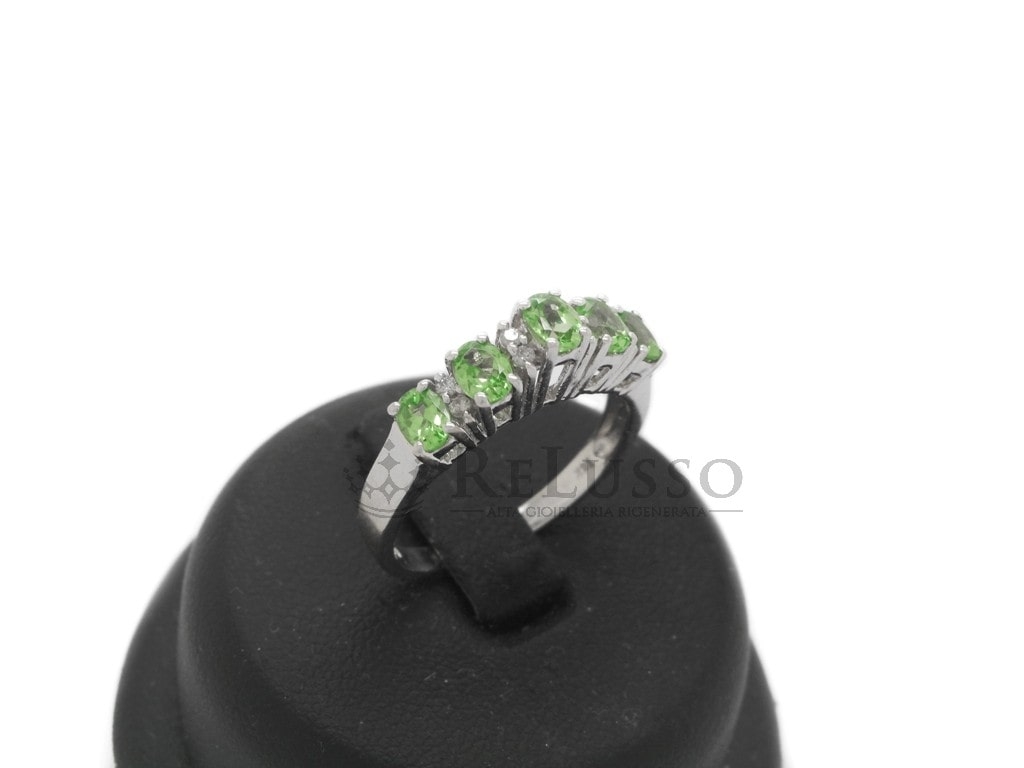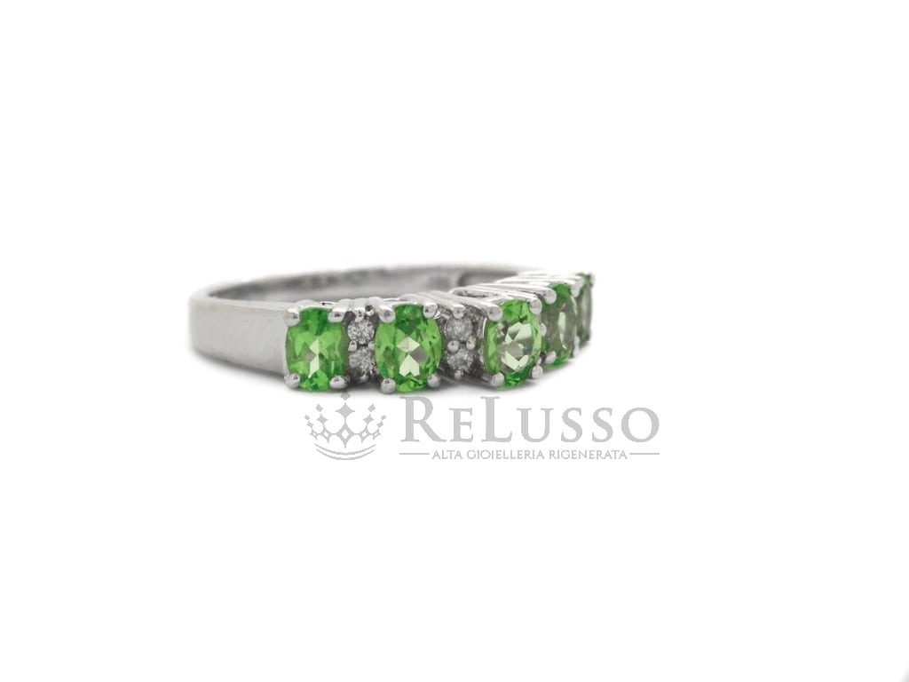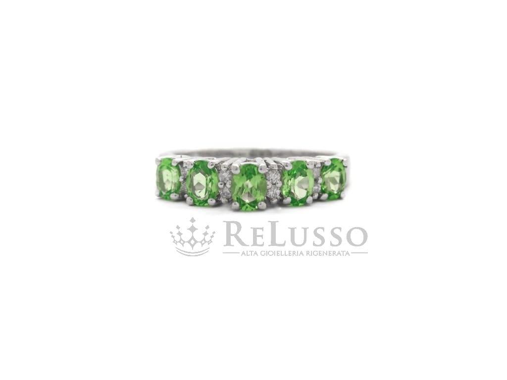 Anello riviera in oro bianco 585 (14 kt) con cinque tsavoriti taglio ovale per un peso complessivo stimato di 1,00ct alternate con otto piccoli diamanti dal peso complessivo stimato di 0,05ct. Misura 15 ITA (Modificabile).