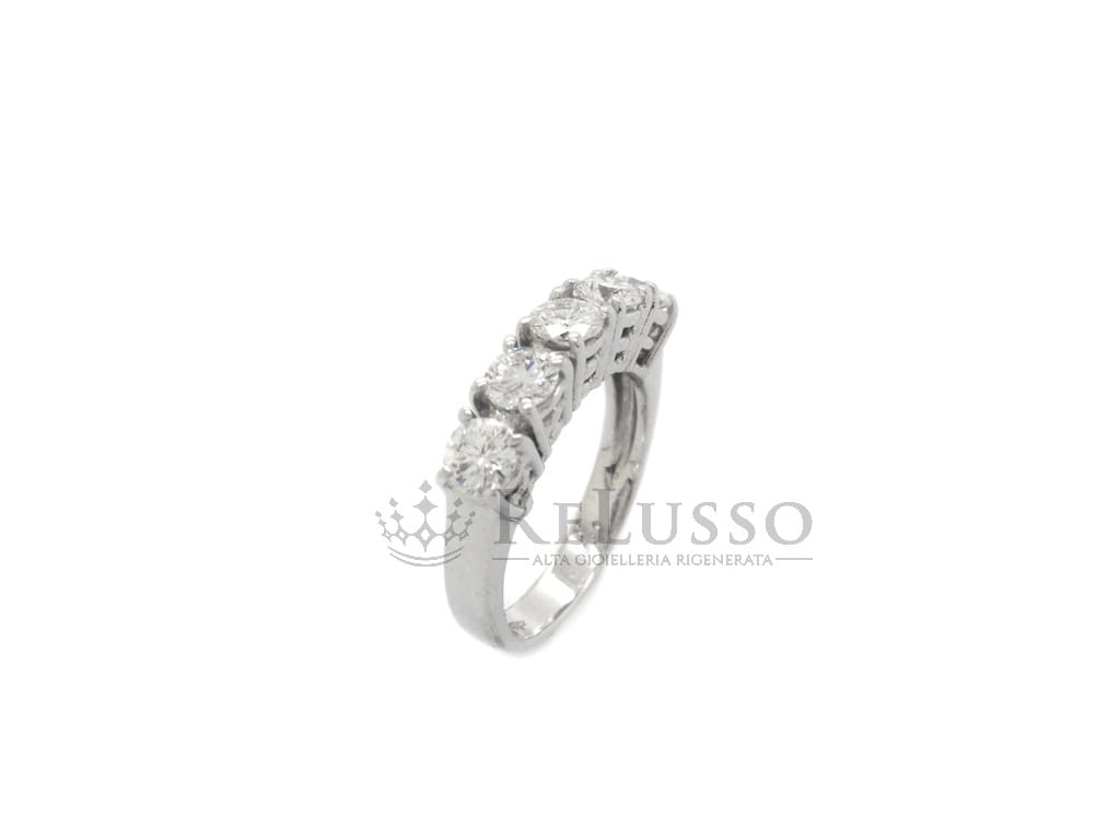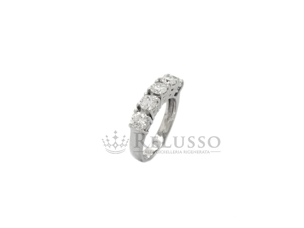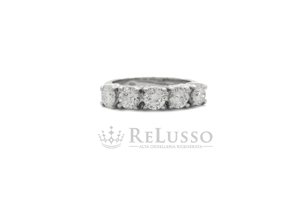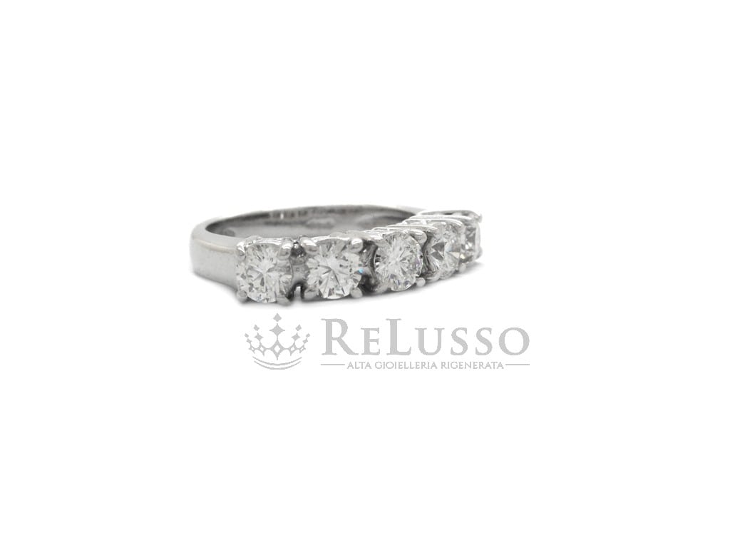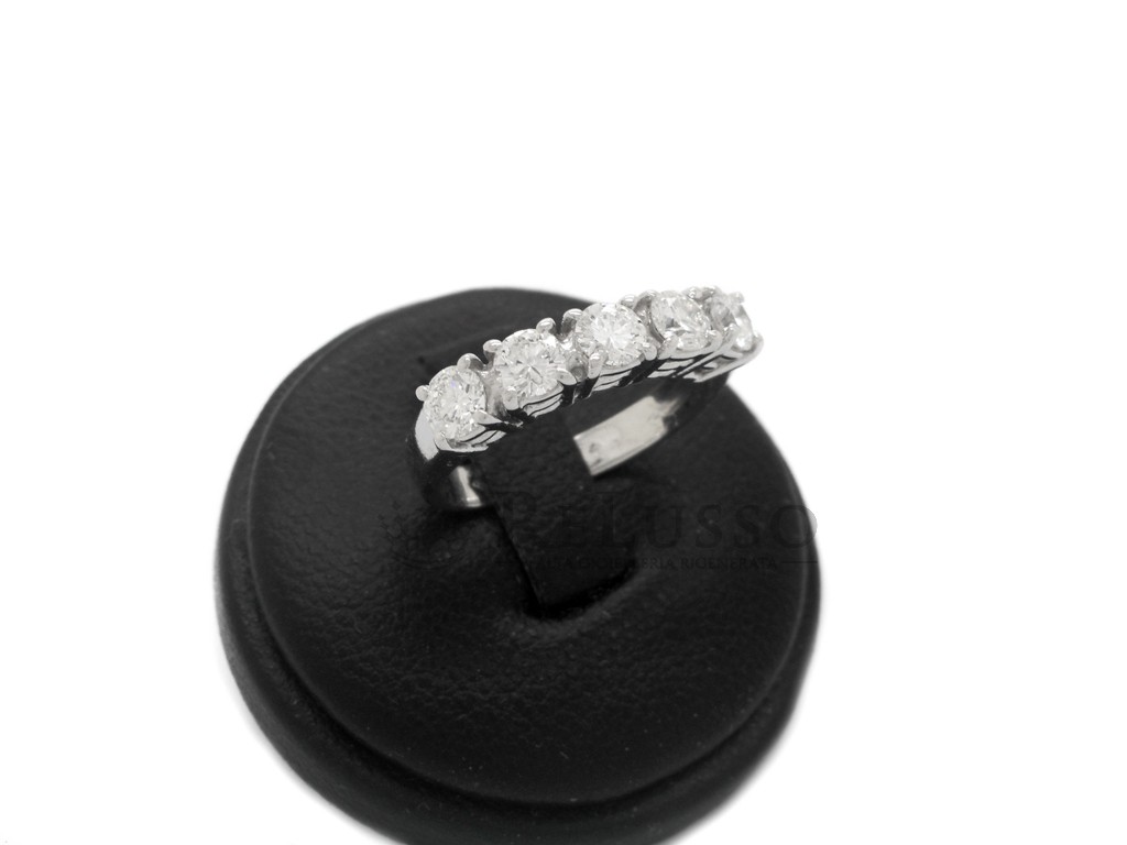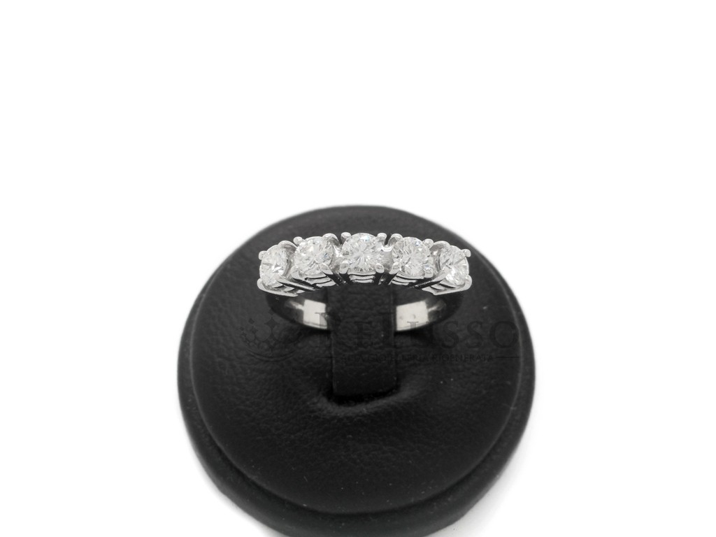Anello riviera in oro bianco 18kt con 5 diamanti taglio brillante rotondo per un peso complessivo di 1,00ct. Le caratteristiche delle pietre sono colore H-I e purezza VS. Misura 10 ITA (modificabile).