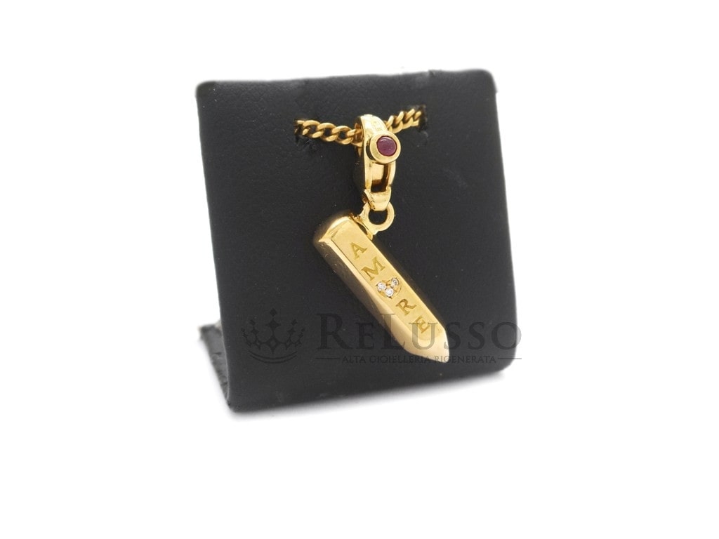 Charm Pasquale Bruni in oro giallo 18kt a forma di matita impreziosito da 3 piccoli diamanti e da un rubino taglio cabochon sulla chiusura. Il Charm è proveniente dalla celebre collezione Amore ed è il completamento ideale per arricchire e personalizzare bracciali e collane Pasquale Bruni.