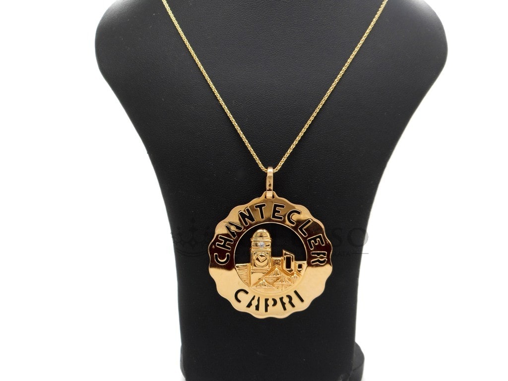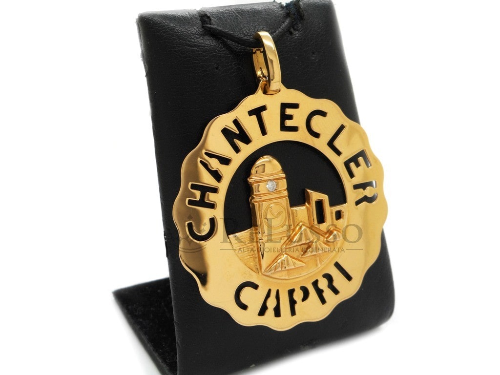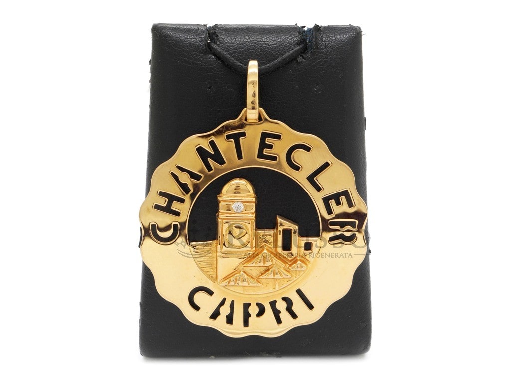 Ciondolo Chantecler misura grande con raffigurata la celebre Piazzetta, in oro giallo 18kt con un diamante taglio brillante rotondo da 0,05ct, proveniente dalla celebre collezione Logo Chantecler.