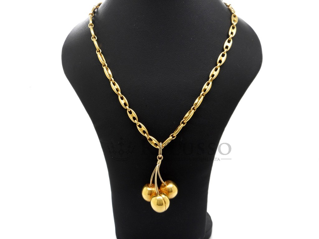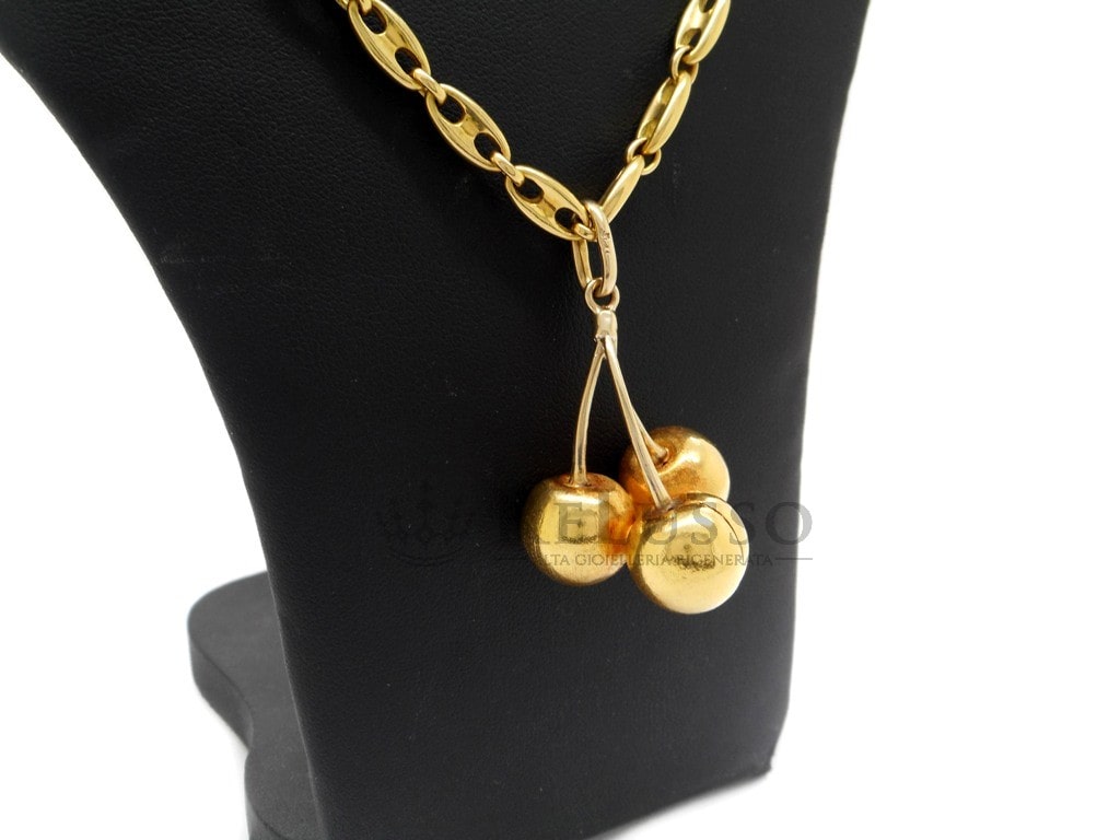 Ciondolo Pomellato Ciliegie in oro giallo 18kt fuori produzione. il pendente pesa 14,39 grammi e le dimensioni sono 4,00 x 2,50cm (anellino incluso) . La collana Pomellato nelle foto viene venduta separatamente.