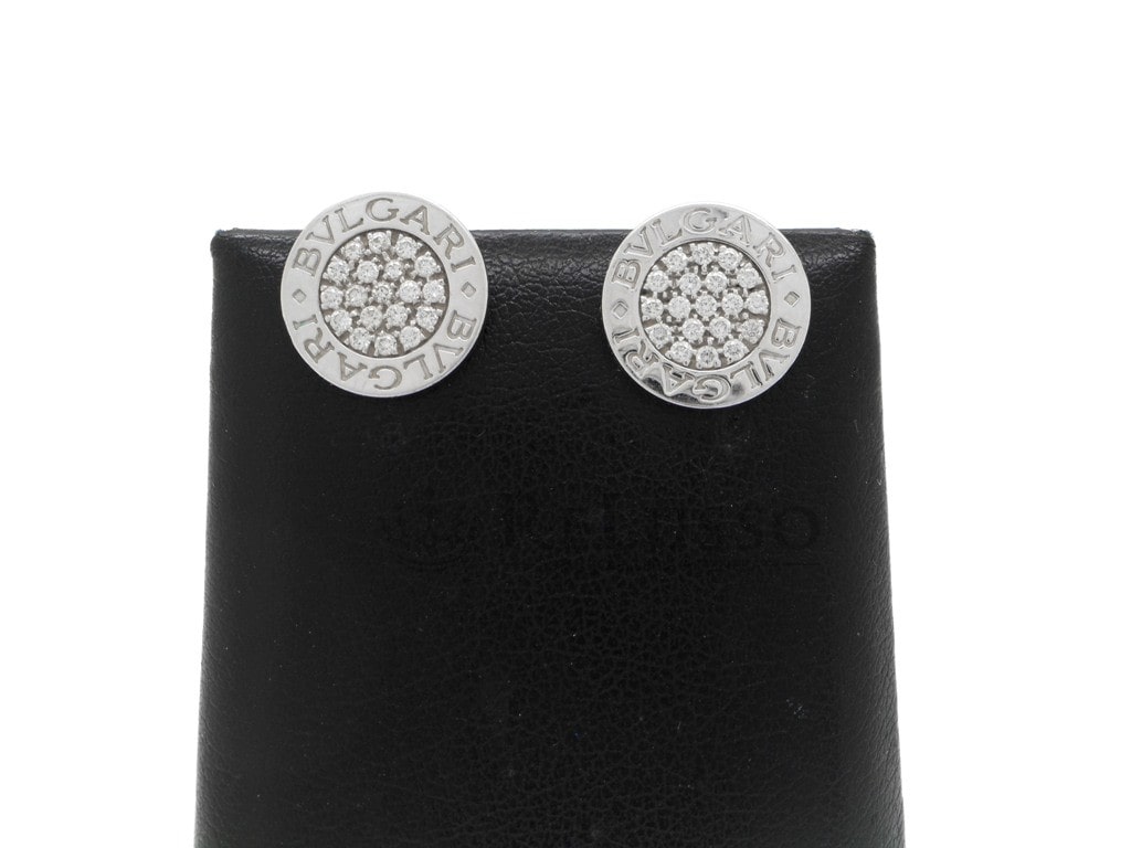 Bulgari-Ohrringe aus der berühmten Bvlgari-Bvlgari-Kollektion aus 18-karätigem Weißgold mit Pavé-Diamanten, bestehend aus 40 runden Diamanten im Brillantschliff mit einem geschätzten Gesamtgewicht von 0,40 ct. Der Durchmesser der Ohrringe beträgt 1,30cm.