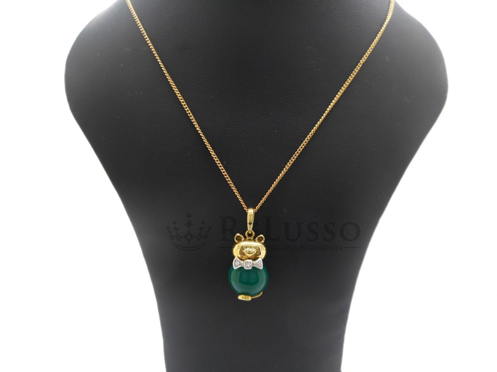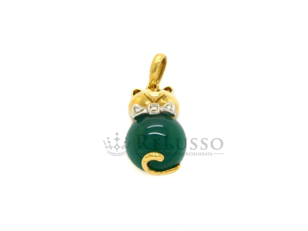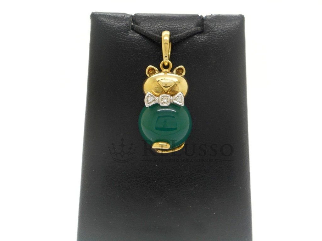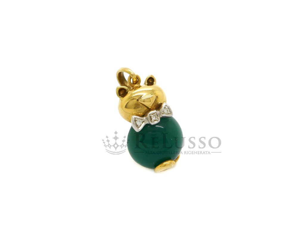 Vintage-Anhänger, signiert von Damiani, mit Katzenmotiv, in 18 Karat Gelbgold, grünem Achat und 3 Diamanten (insgesamt 0,03 Karat). Die Halskette ist separat erhältlich.