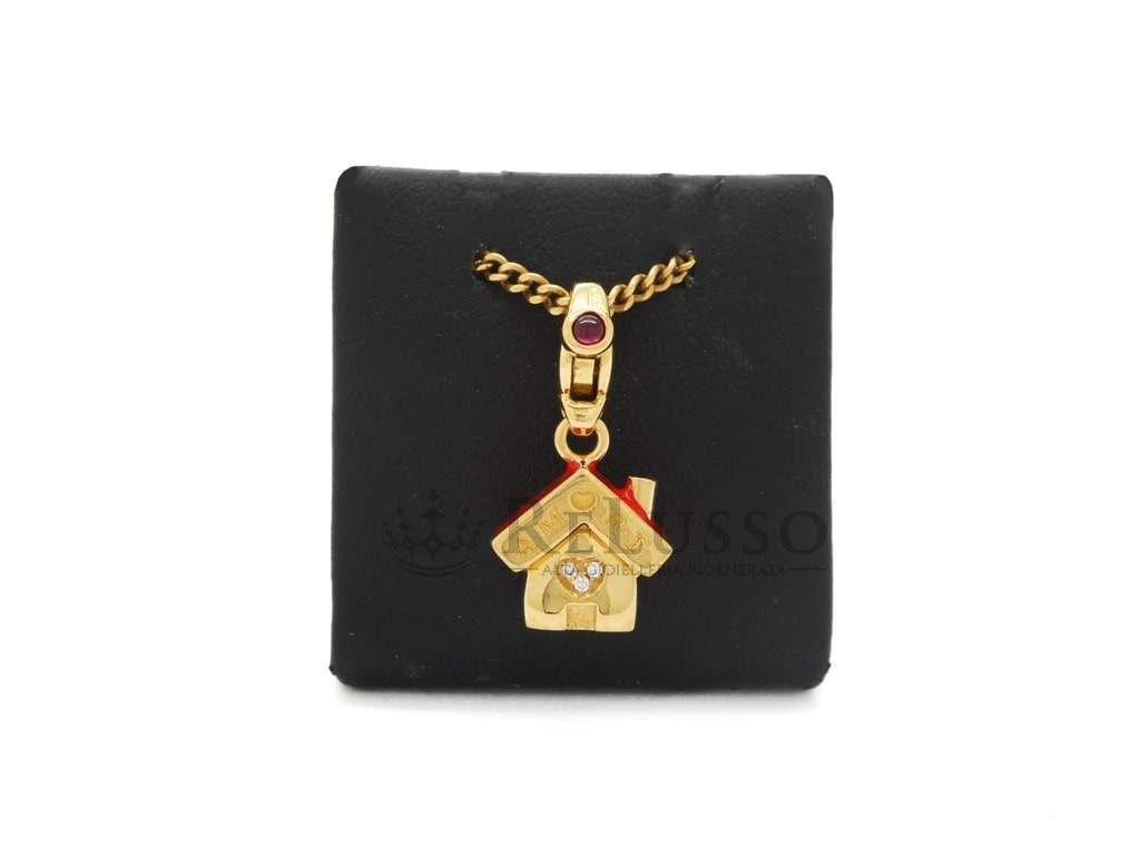 Pasquale Bruni-Charm aus 18-karätigem Gelbgold und hausförmiger Emaille, verziert mit 3 kleinen Diamanten und einem Rubin im Cabochonschliff am Verschluss. Der Charm stammt aus der berühmten Amore-Kollektion und ist die ideale Ergänzung, um Pasquale Bruni-Armbänder und -Halsketten zu bereichern und zu personalisieren