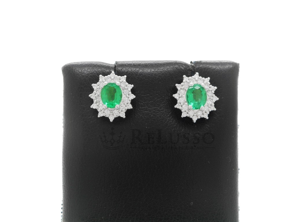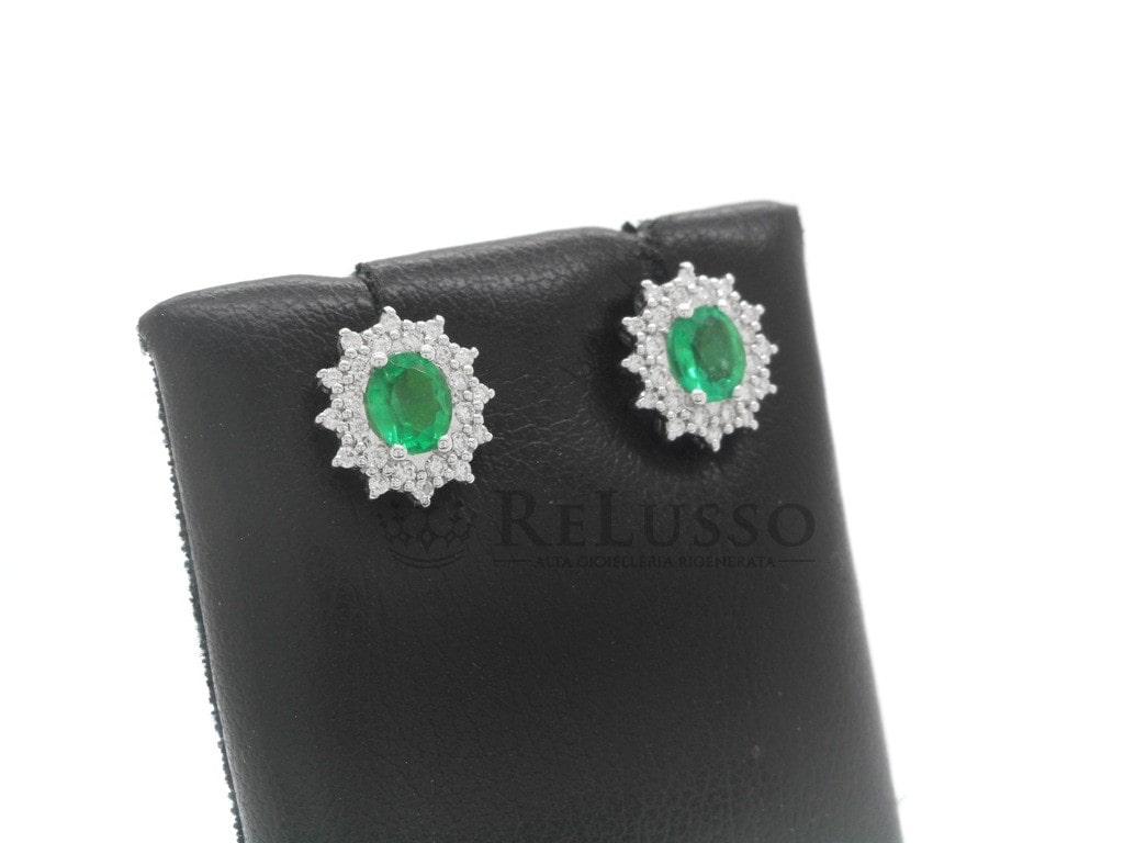 ReCarlo-Ohrringe aus 18-karätigem Weißgold aus der Camelia-Kollektion mit zwei oval geschliffenen Smaragden mit einem Gesamtgewicht von 0,64 ct und einer Reihe Diamanten mit ein Gesamtgewicht von 0,27 ct Farbe F Reinheit VS.