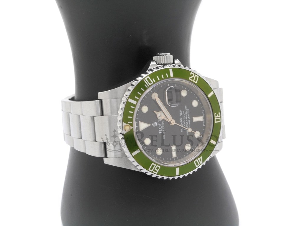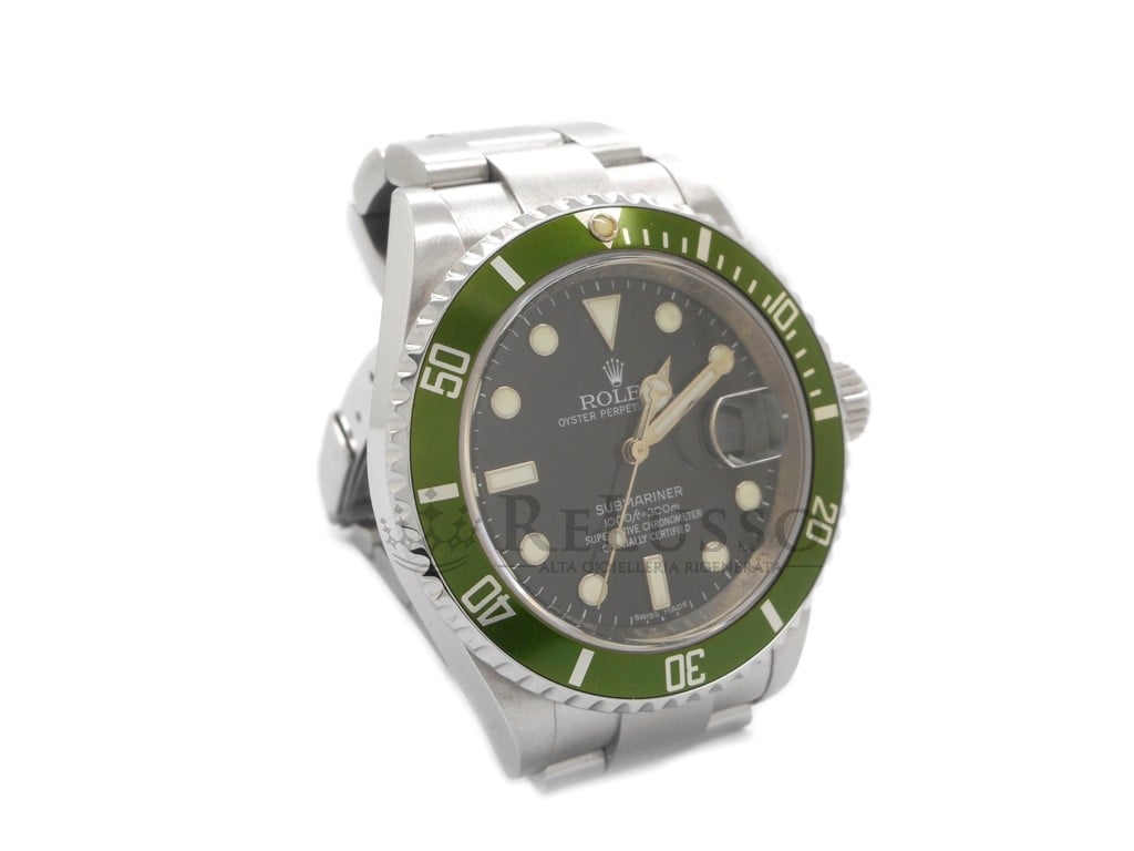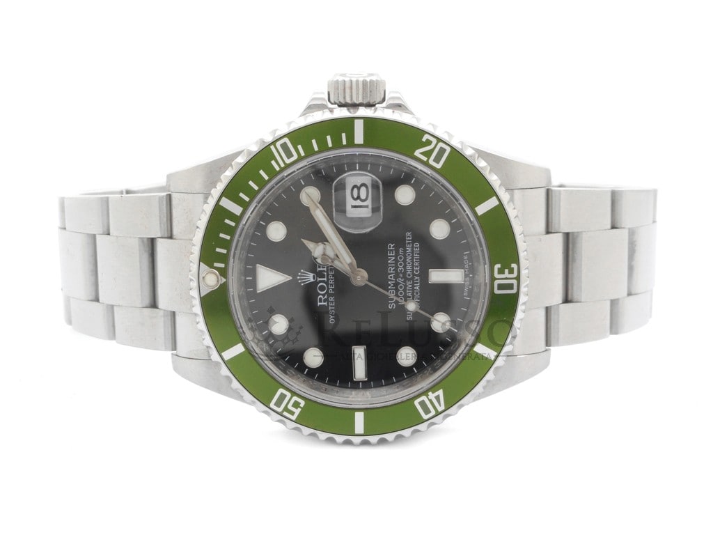 Rolex Submariner Ref. 16610LV „Kermit“ aus Stahl, schwarzes Zifferblatt, Stahlgehäuse, 40 mm Durchmesser, grüne drehbare Lünette, Oyster-Armband aus Stahl mit Oysterlock-Sicherheitsschließe, Automatikwerk, Saphirglas mit Zykloplinse auf der Datumsanzeige. Jahr 2008.