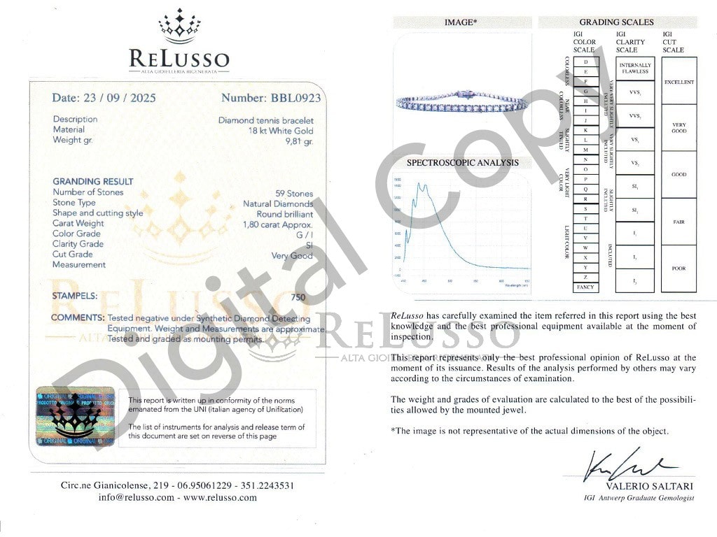 Tennis bracelet in 18kt white gold with 59 round brilliant-cut diamonds for an estimated total weight of 1.80 ct, G-I color, SI clarity.