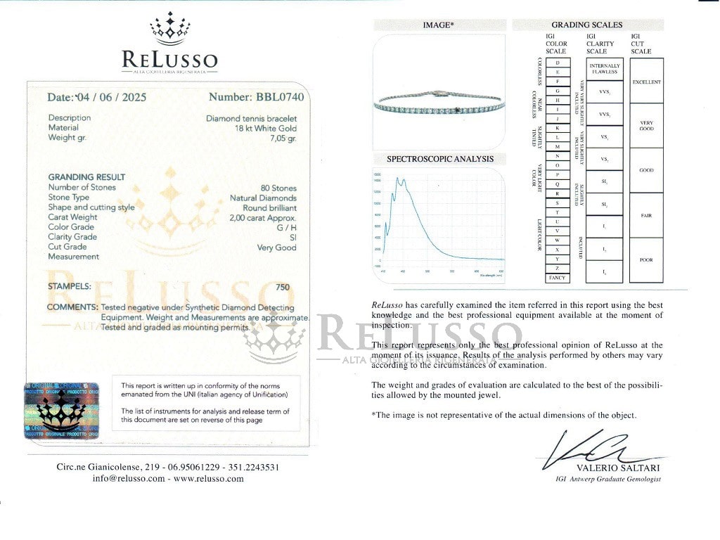 The ring is accompanied by a ReLusso gemological certificate drawn up by Valerio Saltari, Igi Antwerp graduated gemologist.