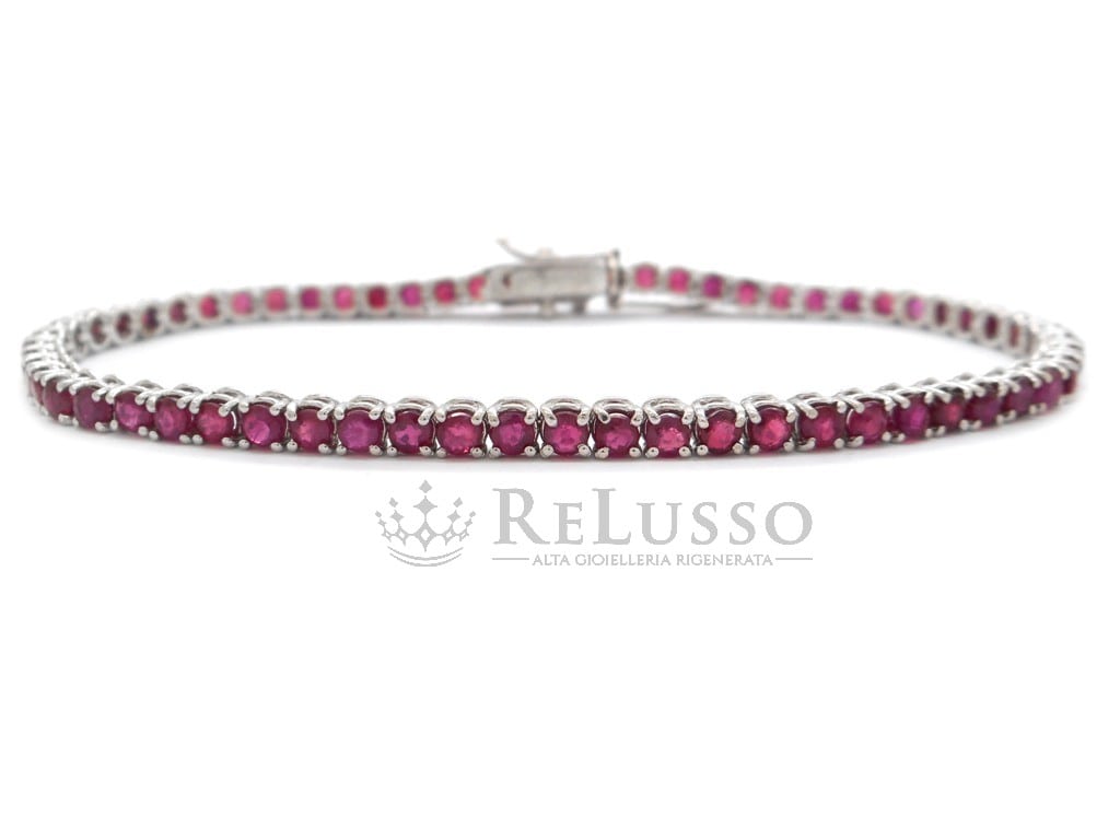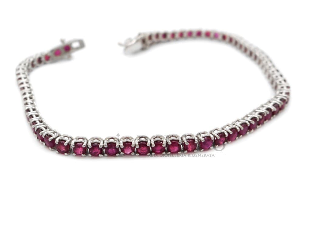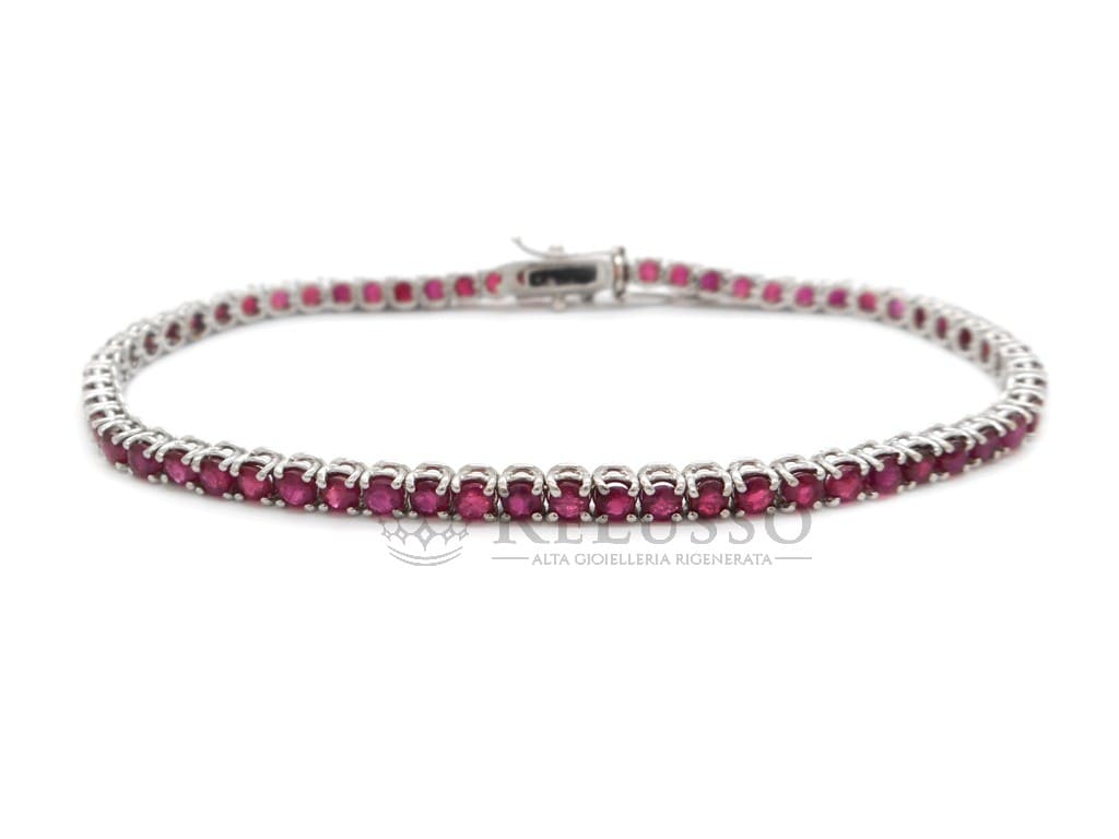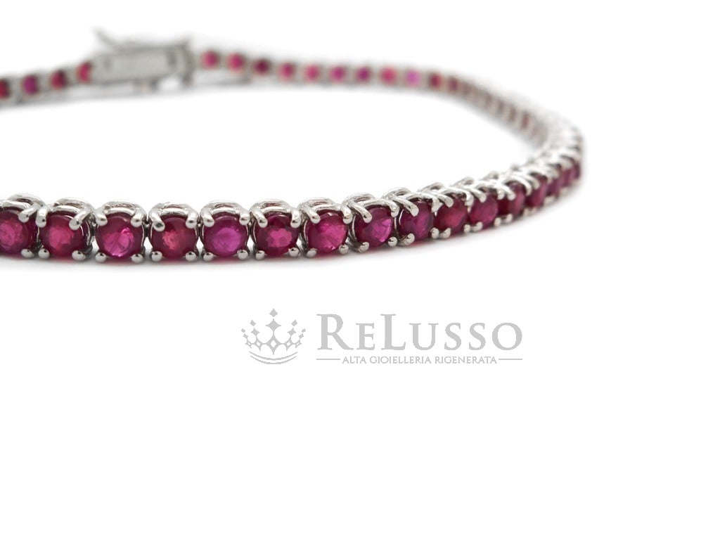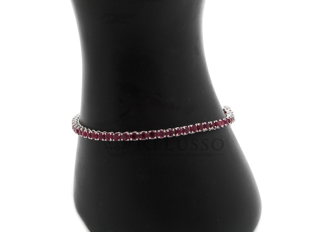 Tennis bracelet in 18kt white gold with 62 rubies for an estimated total weight of 4.00ct. The tennis is 18.50cm long.
