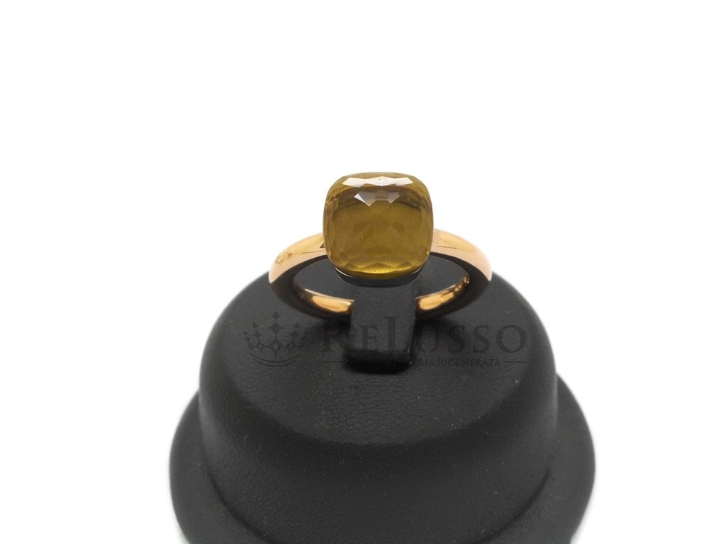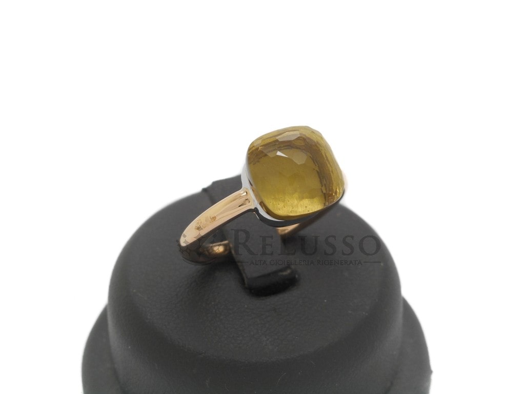 Anillo Pomellato de oro rosa de 18kt con cuarzo limón facetado, de la famosa colección Nudo, modelo Classic.
