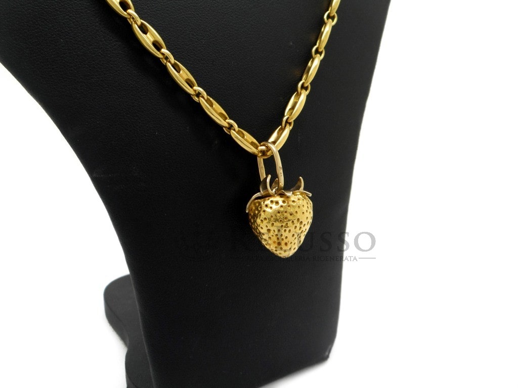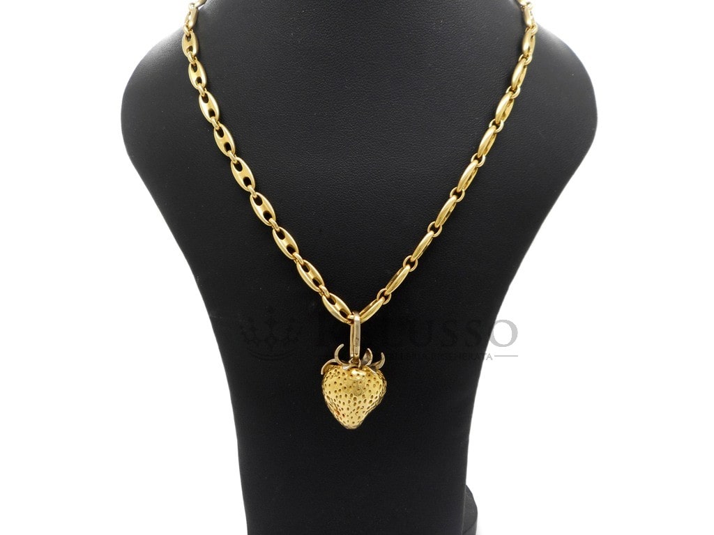 Colgante fresa Pomellato en oro amarillo de 18kt fuera de producción. El colgante pesa 15,00 gramos y sus dimensiones son 3,20 x 1,80cm (anillo incluido). El collar Pomellato que aparece en las fotos se vende por separado.