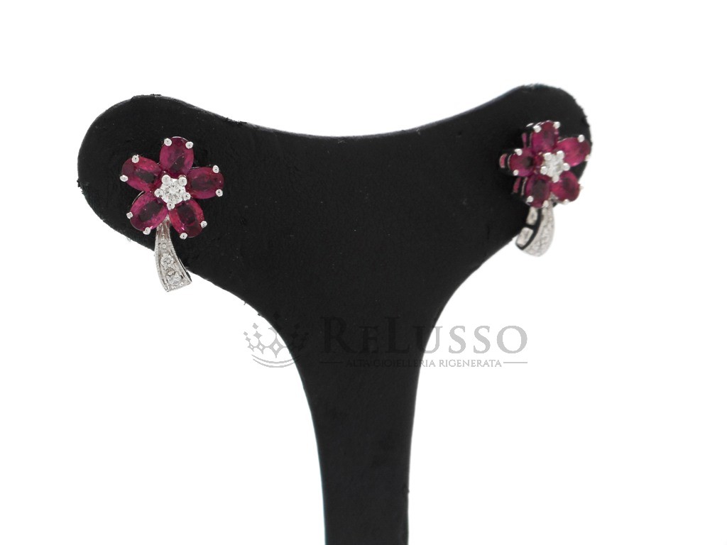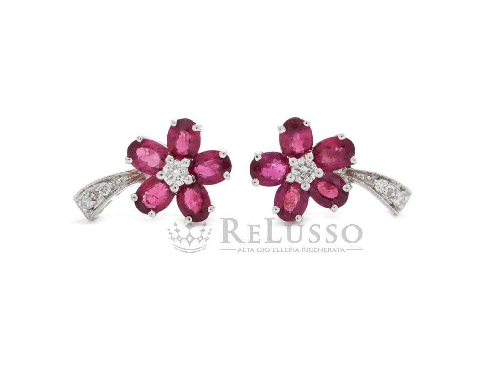 Pendientes de flor en oro blanco de 18 kt con 2,32 ct de rubíes talla ovalada y 0,16 ct de diamantes redondos talla brillante.