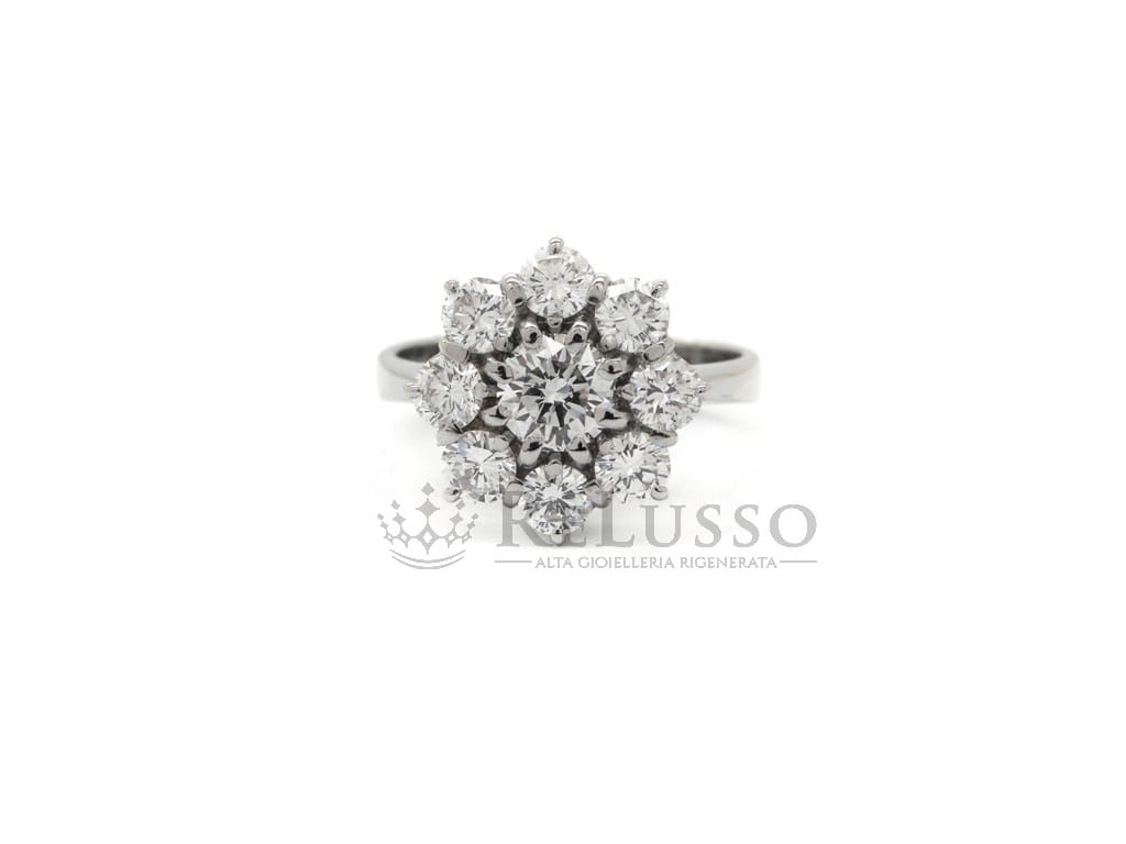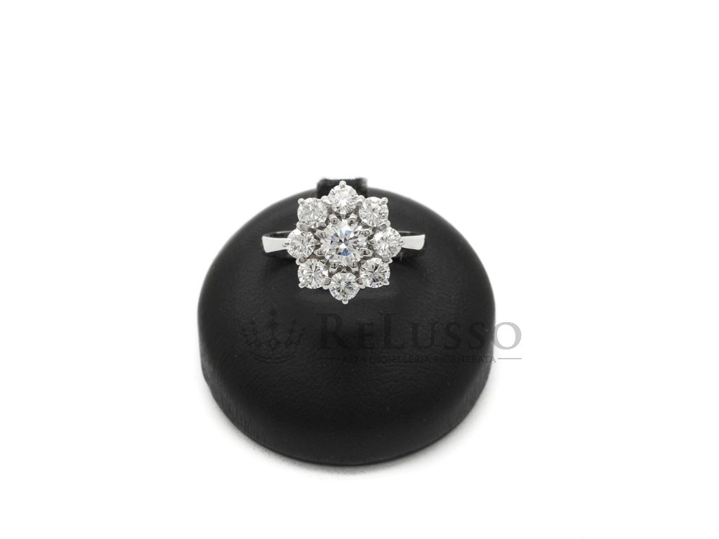 Anillo flor en oro blanco de 18kt con un diamante talla brillante en el centro con un peso estimado de 0,60 ct, rodeado de 8 diamantes talla brillante para un peso total estimado de 1,00 ct. El anillo es una talla 17 ITA (Editable), las características de las piedras son color H-I, claridad VS-SI.