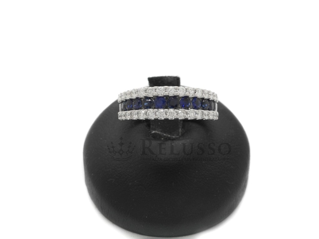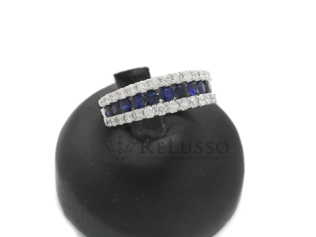 La bague est composée de deux rangées de diamants ronds taille brillant pour un poids total estimé de 0,80 ct, de couleur H-I et de pureté VS-SI, et d’une rangée centrale de saphirs bleus pour un poids total estimé de 0,80 ct. poids total de 0,70 ct.