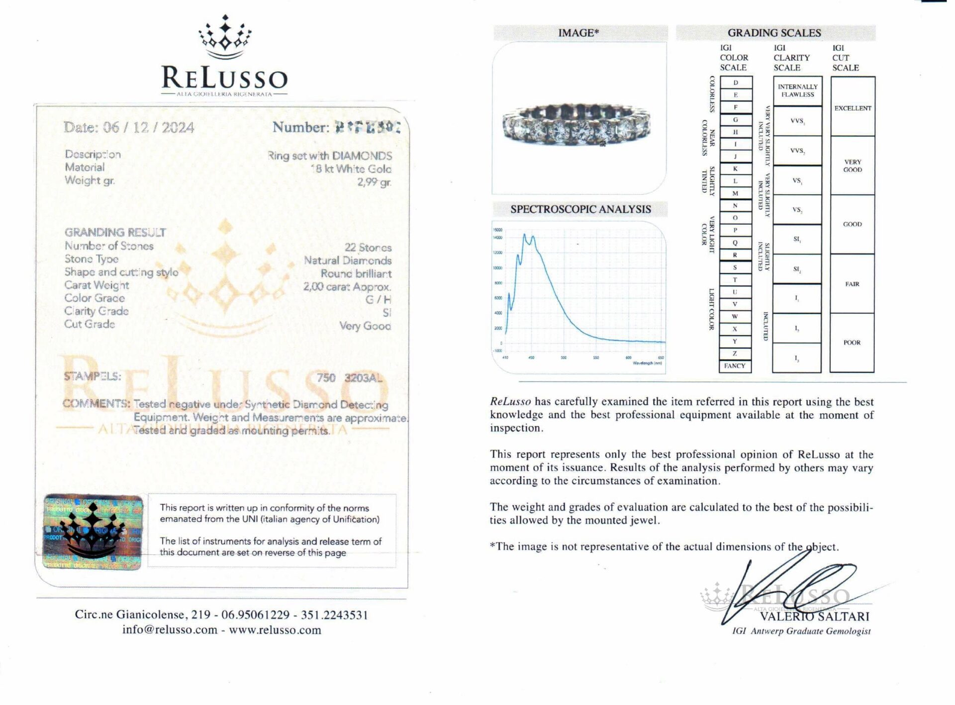 Bague ronde modèle Eternity en or blanc 18 carats, avec 22 diamants ronds taille brillant pour un poids total estimé à 2,00ct. totaux, couleur G-H, pureté SI.