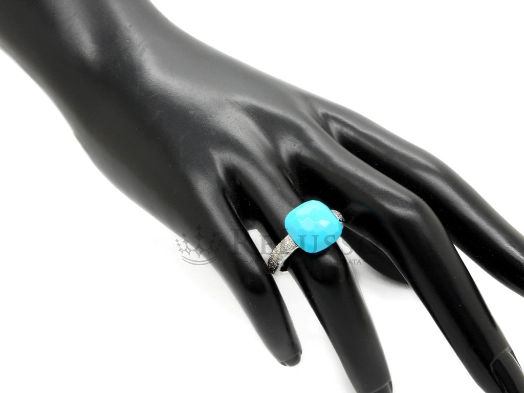 Bague Pomellato en or blanc 18 kt avec turquoise taille coussin à facettes et diamants ronds taille brillant pour un poids total de 0,26 ct.