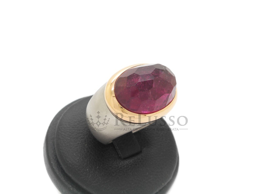 Bague Pomellato de la collection Iceberg, en or blanc sablé et or jaune 18 carats avec une Tomalina taillée facettée. Taille 12 ITA.