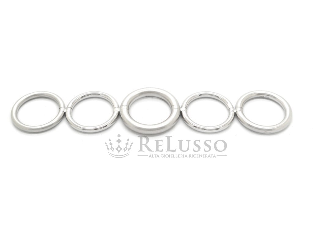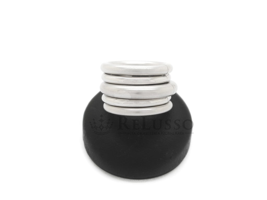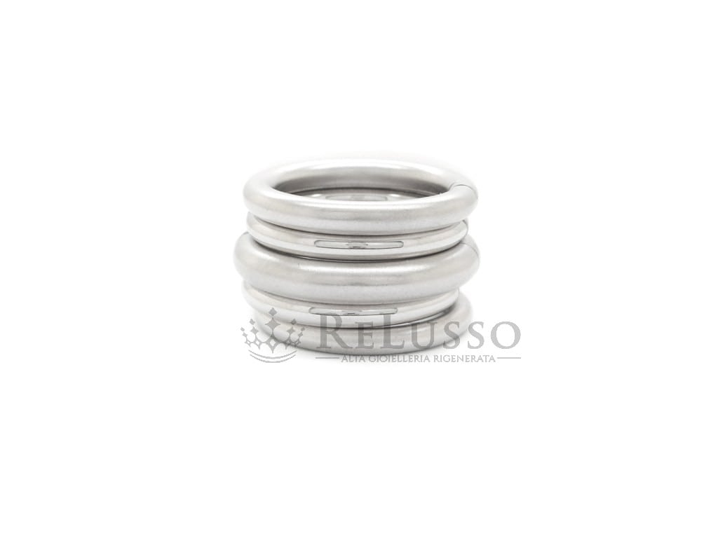 Bague Pomellato Gioco en or blanc 18 ct composée de cinq alliances, trois polies et deux sablées, reliées entre elles par une série d’articulations.