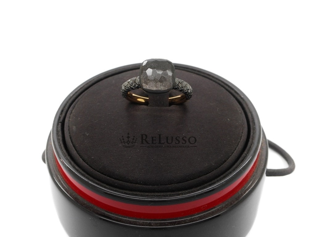 Bague Pomellato Nudo Obsidian, modèle classique, en or rose 18 ct et titane, avec Obsidienne facettée de 6,30 ct et 57 diamants noirs traités pesant au total 0,72 ct. Taille 16 ITA.