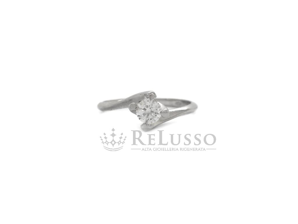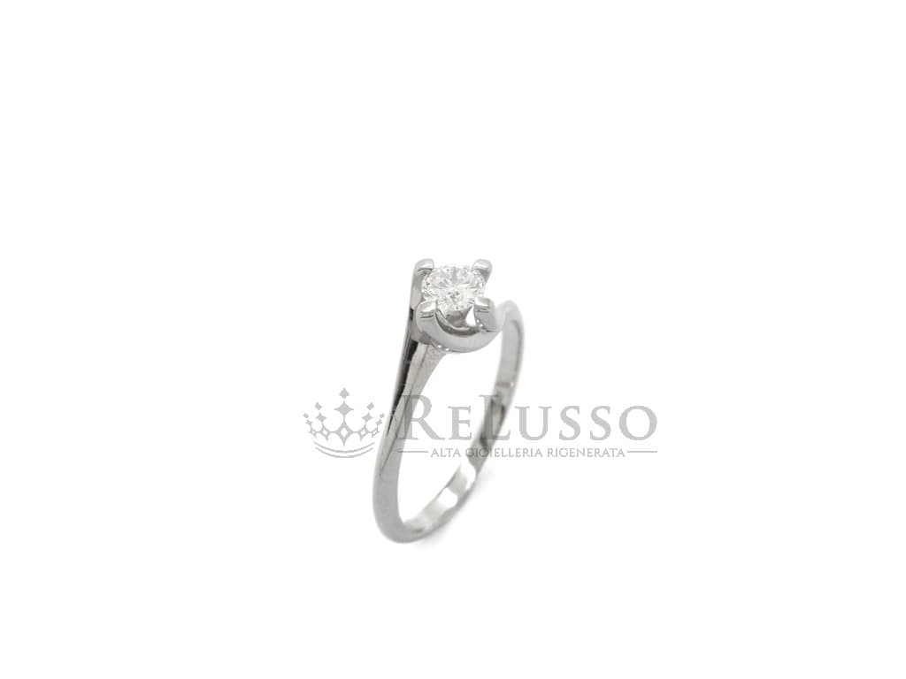 Bague solitaire en or blanc 18 carats avec un diamant rond taille brillant d’un poids estimé à 0,40 ct, serti dans une monture Valentino à 4 griffes en or blanc. Le solitaire est une taille 13 ITA (modifiable), les caractéristiques de la pierre sont Couleur G-H et clarté VS.