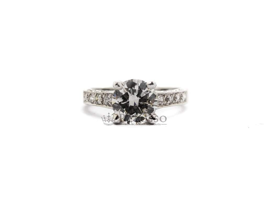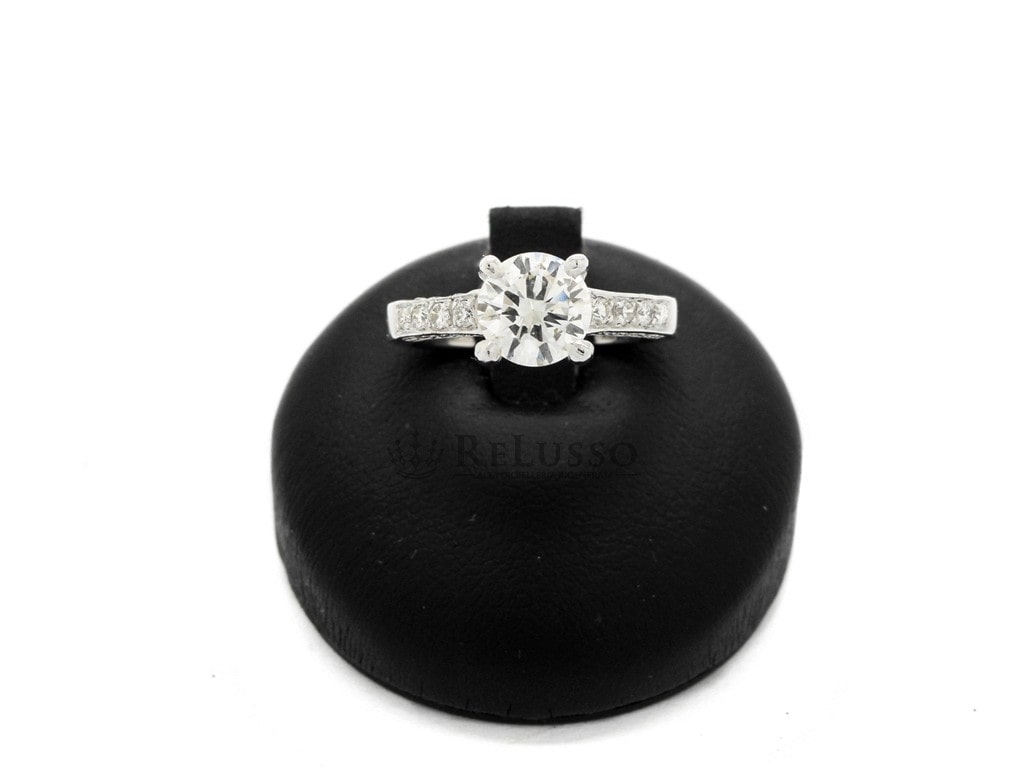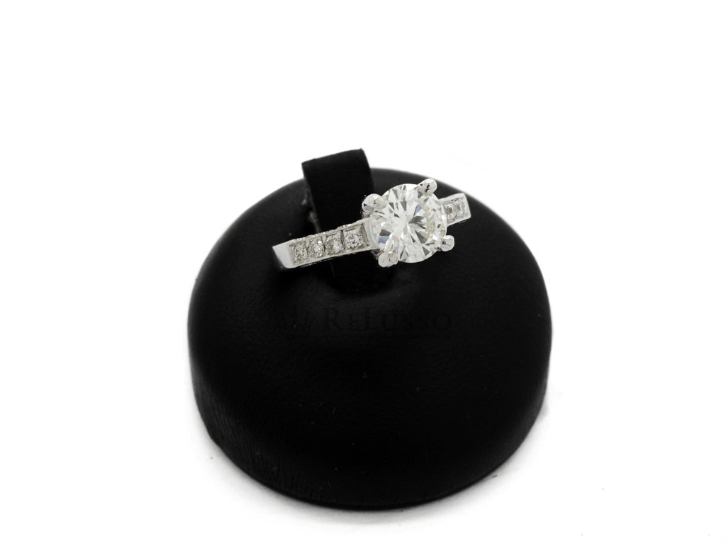 Bague solitaire en or blanc 18 kt avec diamant taille brillant rond 1,15 ct serti dans un sertissage en or blanc à 4 griffes avec 10 diamants de chaque côté pour un poids total de 0, 20 carats au total.
