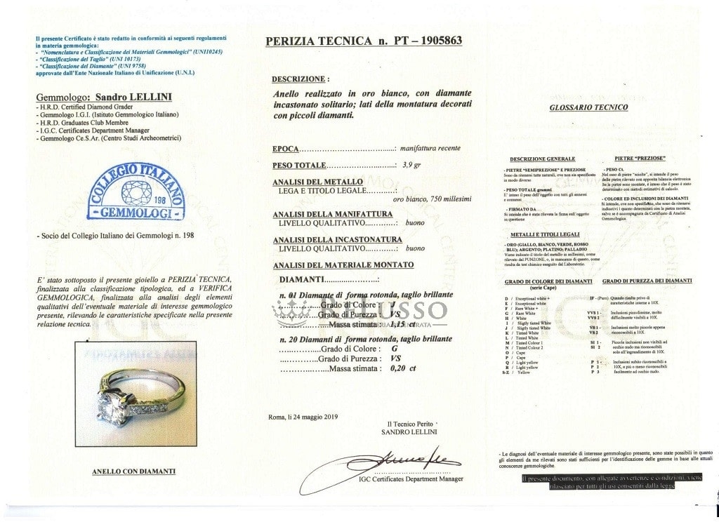 La bague est accompagnée d’un certificat gemmologique I.G.C. (Centre international de gemmologie), édité par Sandro Lellini.