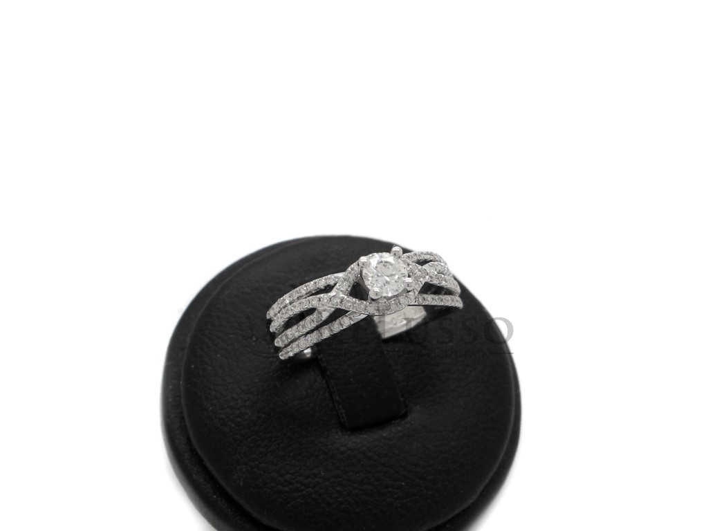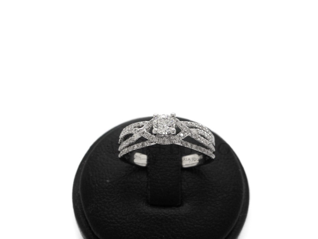 Bague solitaire en or blanc 18 carats sertie d’un diamant taille brillant rond au centre, d’un poids estimé à 0,25 ct, entouré de 86 diamants taille brillant rond, pour un poids total estimé à 0,21 ct. Taille 14 ITA (légèrement modifiable).