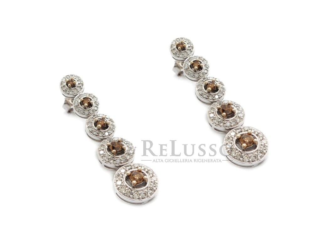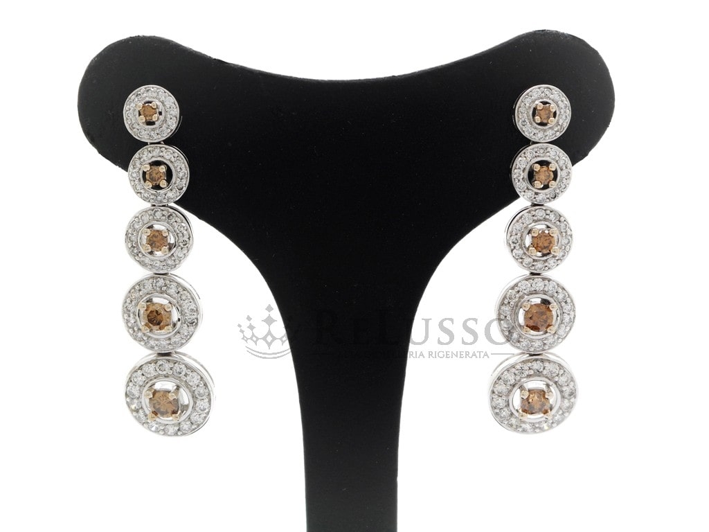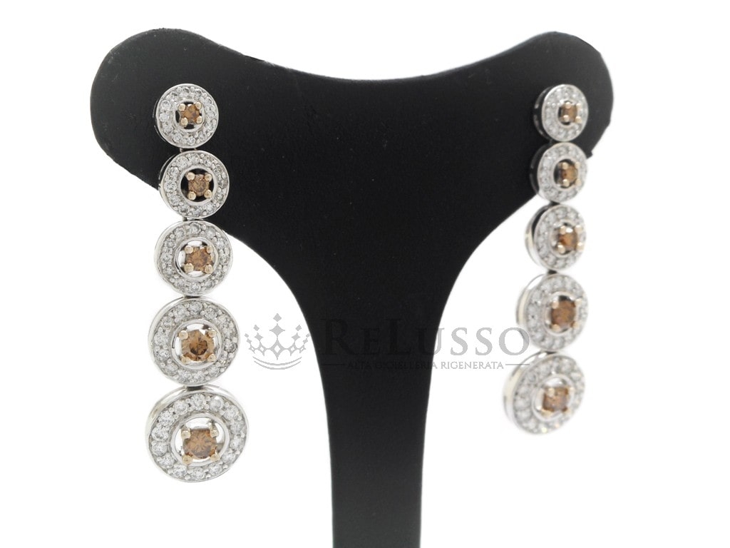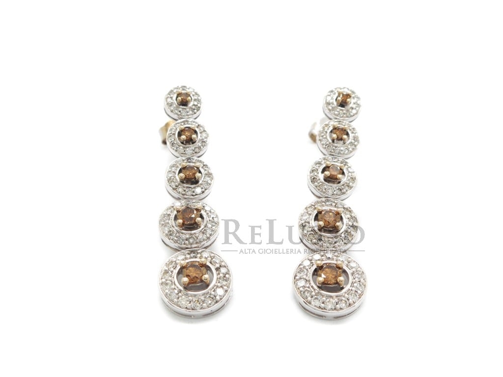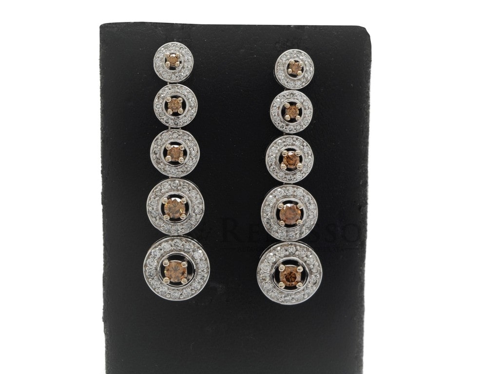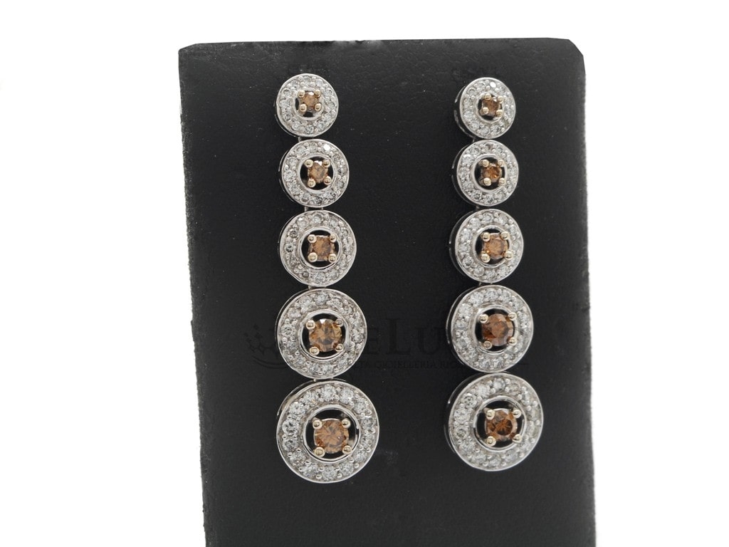Orecchini pendenti in oro bianco 14kt (oro 585) con 10 diamanti Fancy Brown, taglio brillante rotondo, dal peso complessivo stimato di 0.65ct contornati da 126 diamanti taglio brillante rotondo dal peso complessivo stimato di 1,10ct.