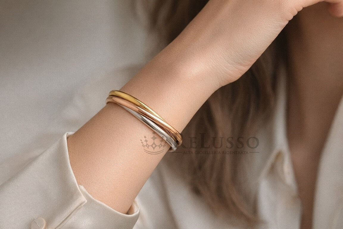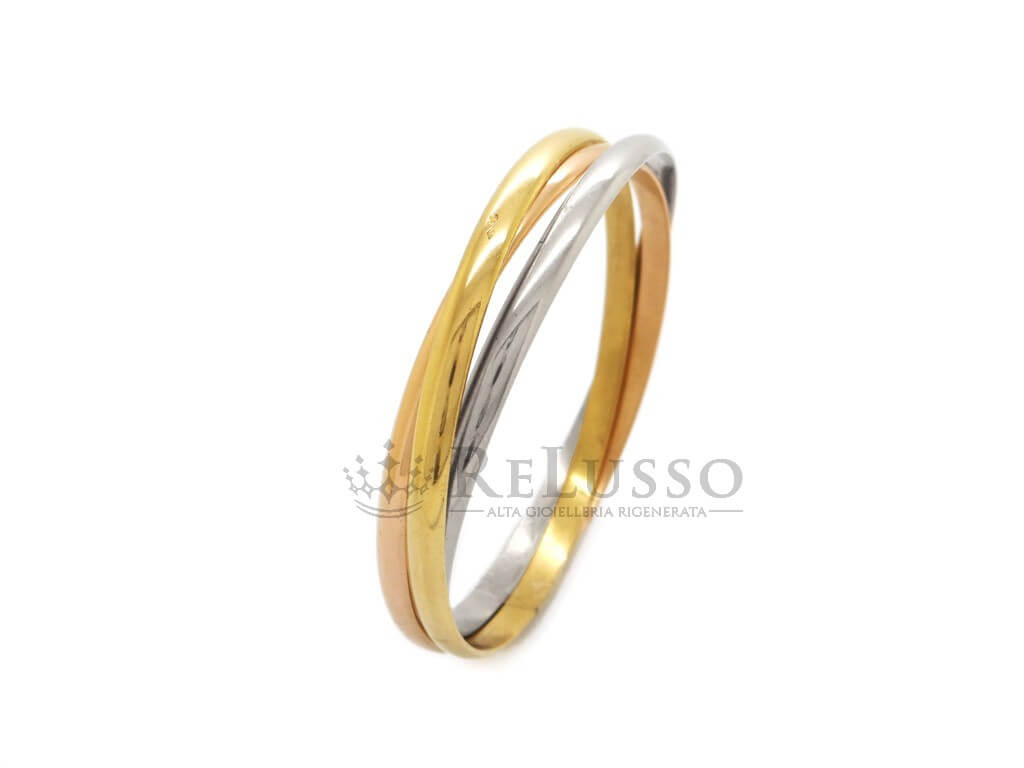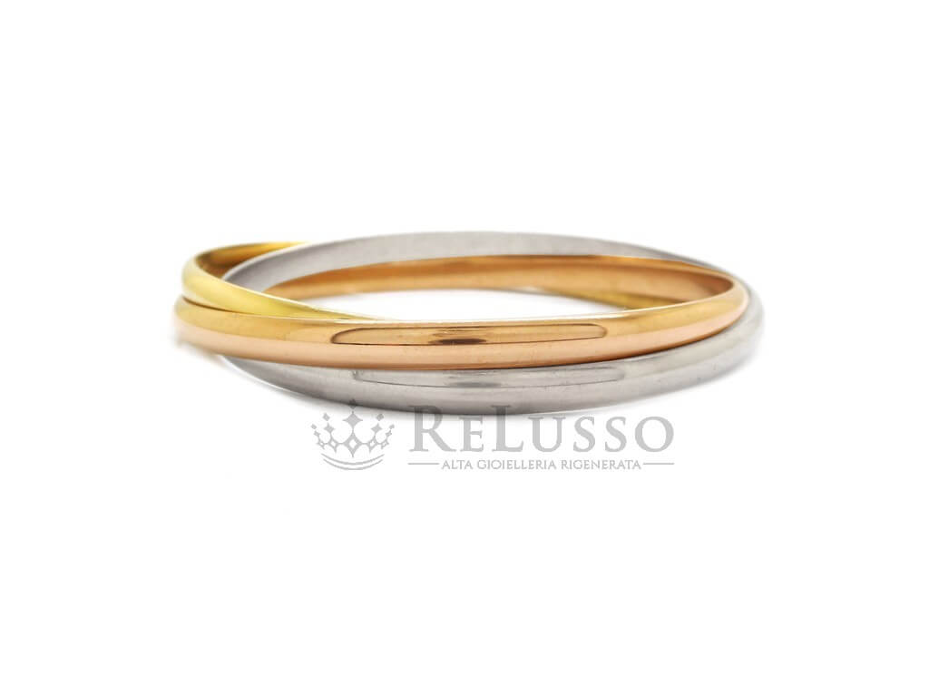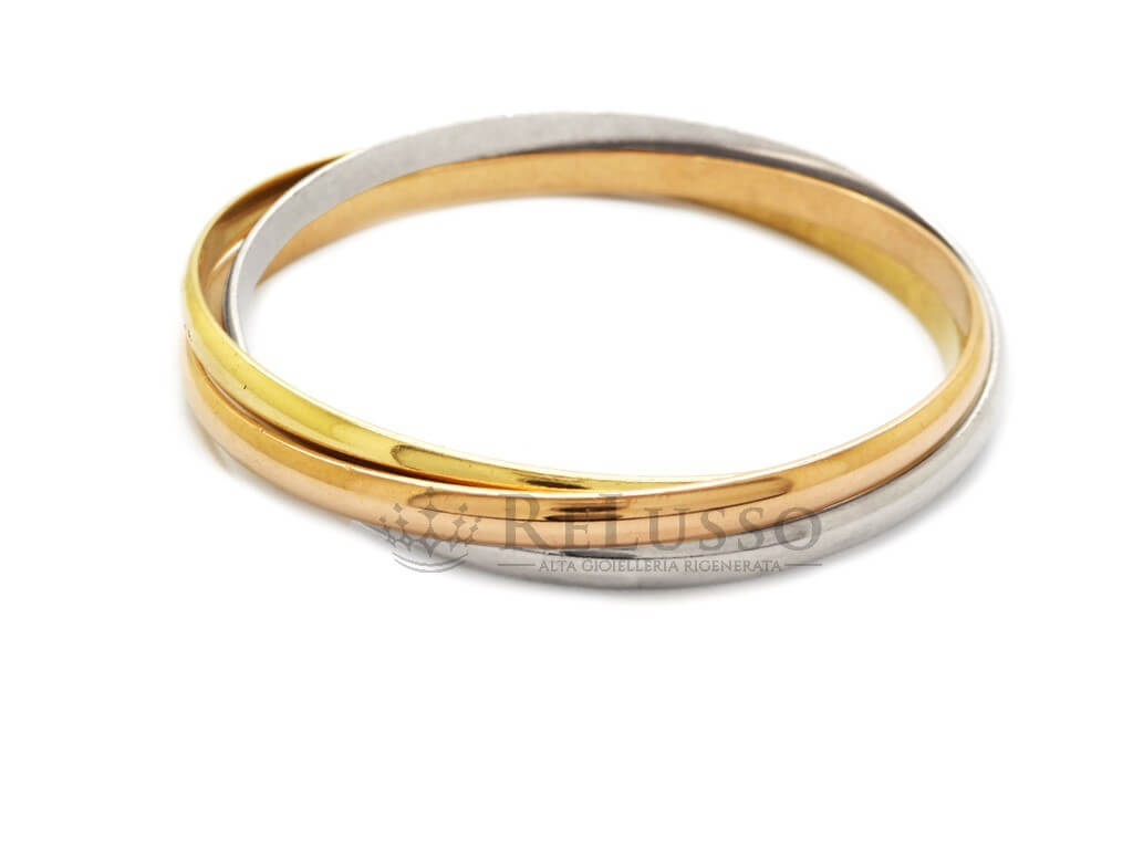 Trois anneaux entrelacés en or rose, or jaune et or blanc 18kt, qui glissent avec fluidité autour du poignet. Une signature esthétique reconnaissable entre toutes.