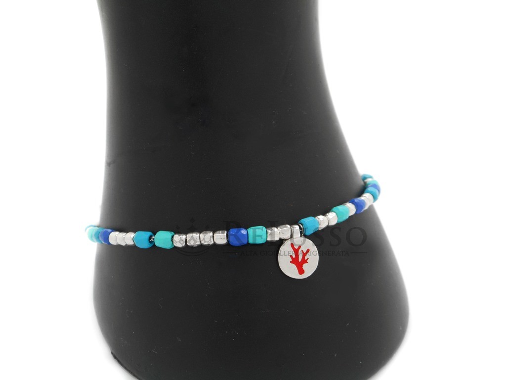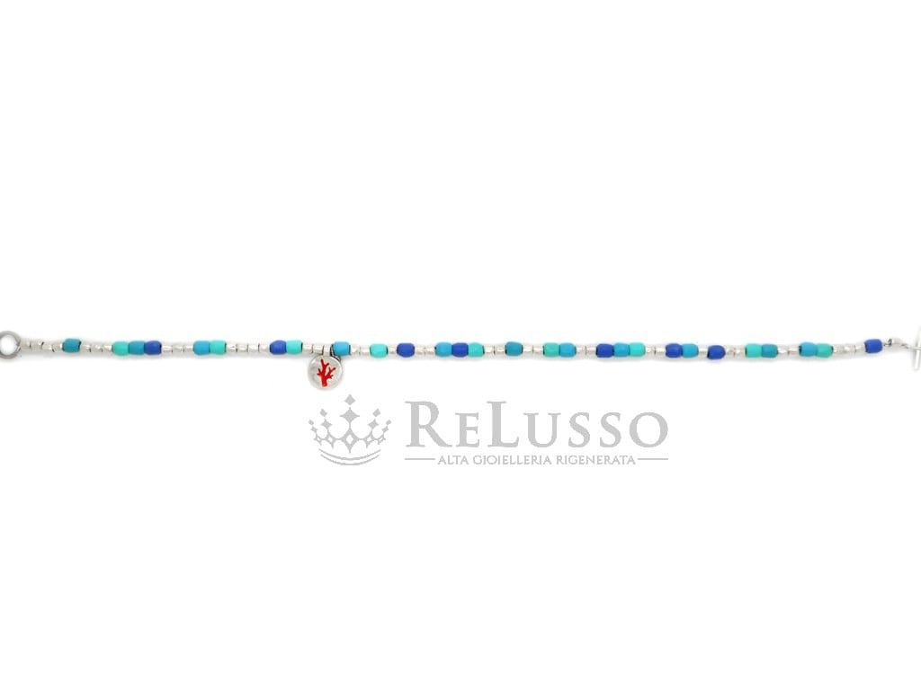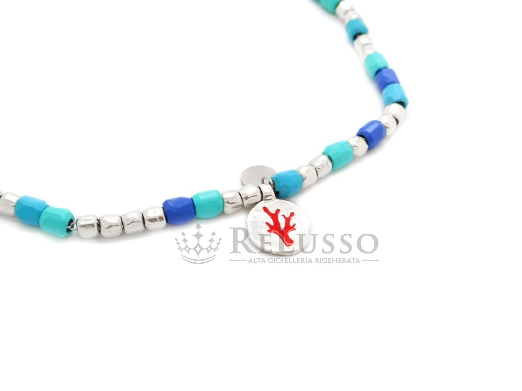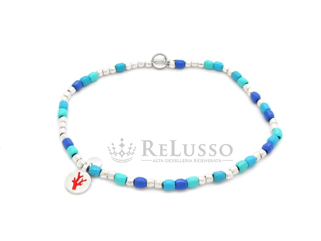 Bracelet Dodo Tenaka Mini Granelli en plastique recyclé bleu, noyau, brisè et plaque en acier, barre en T et pendentif en argent sterling 925.