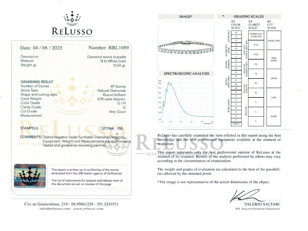 La bague est accompagnée d’un certificat gemmologique ReLusso établi par Valerio Saltari, gemmologue diplômé de l’IGI d’Anvers.