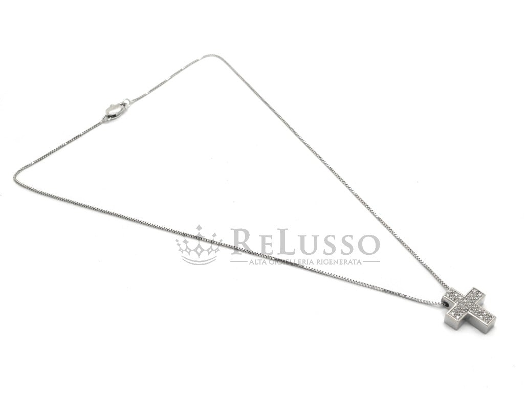 Collier Salvini avec croix en or blanc 18 kt avec diamants ronds taille brillant pour un poids total estimé à 0,21 ct. Les dimensions de la croix sont de 1,60×1,40cm, le collier mesure 42,00cm de long, et possède un petit diamant taille brillant sur le fermoir.