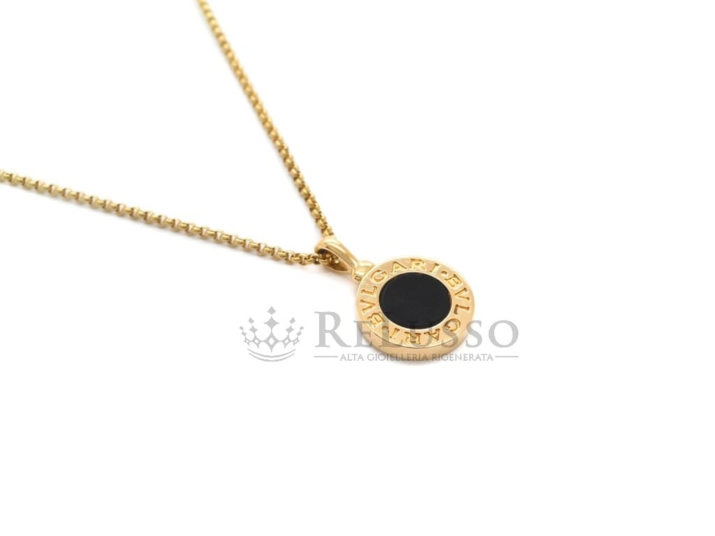 Collier Bvlgari avec chaîne en or jaune 18 ct et pendentif en or jaune 18 ct et onyx, de la célèbre collection Bvlgari-Bvlgari. Le collier mesure 43,00 cm de long et peut être ajusté à deux tailles différentes, le diamètre du pendentif est de 1,00 cm.