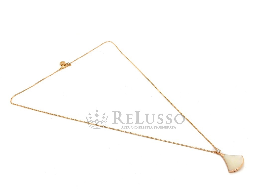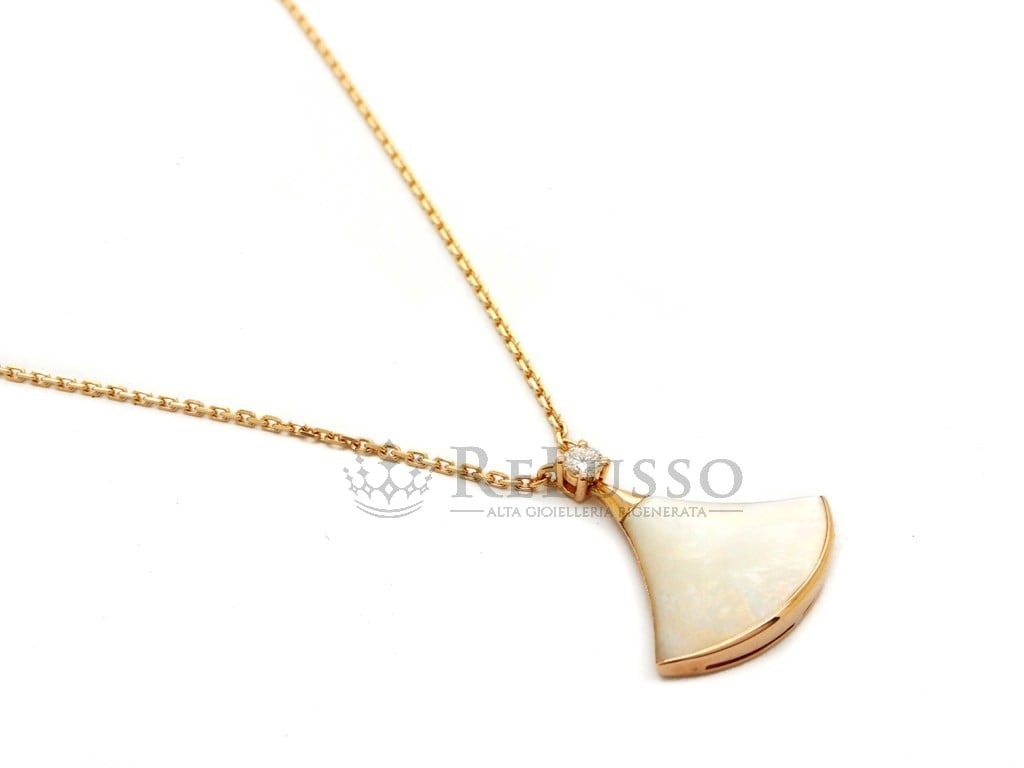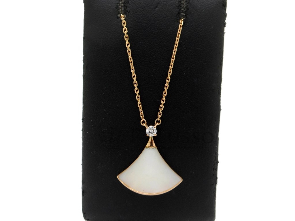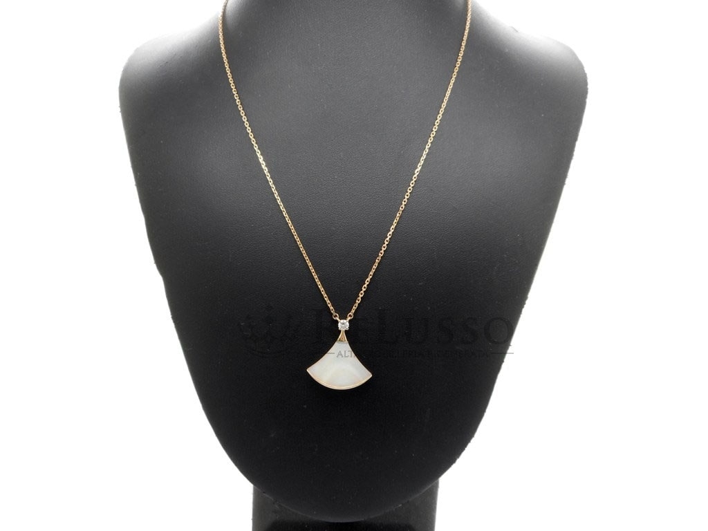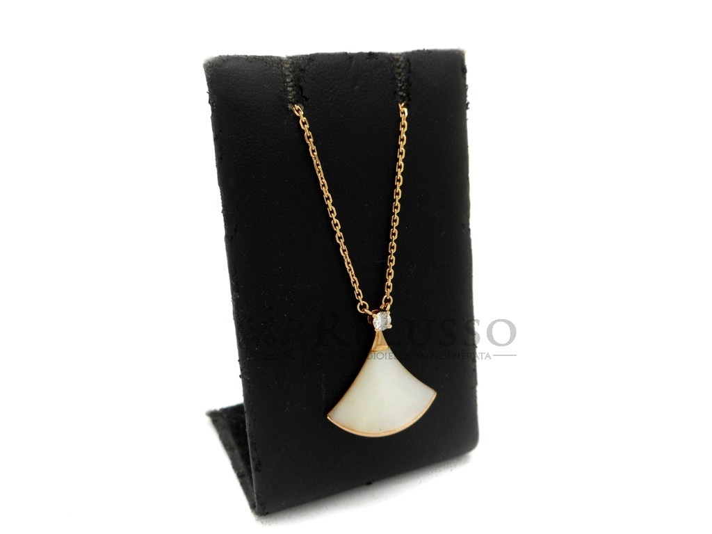 Collier Bulgari en or rose 18 ct de la collection Diva’s Dream, avec un pendentif en nacre avec un diamant de 0,11 ct. Le collier est 54. 00cm, réglable à 51.00.