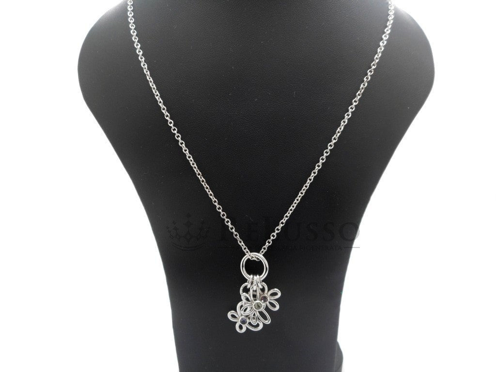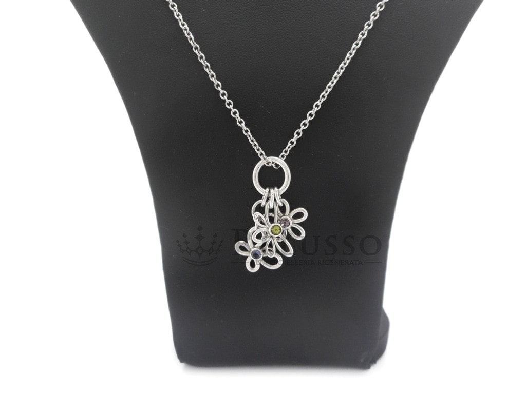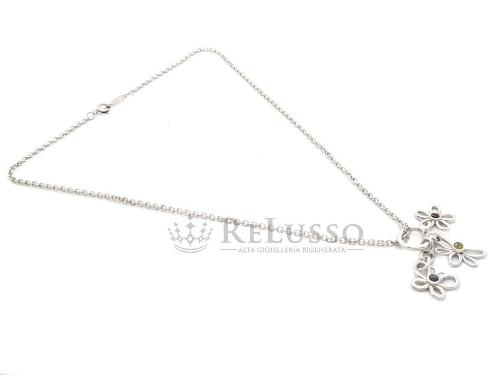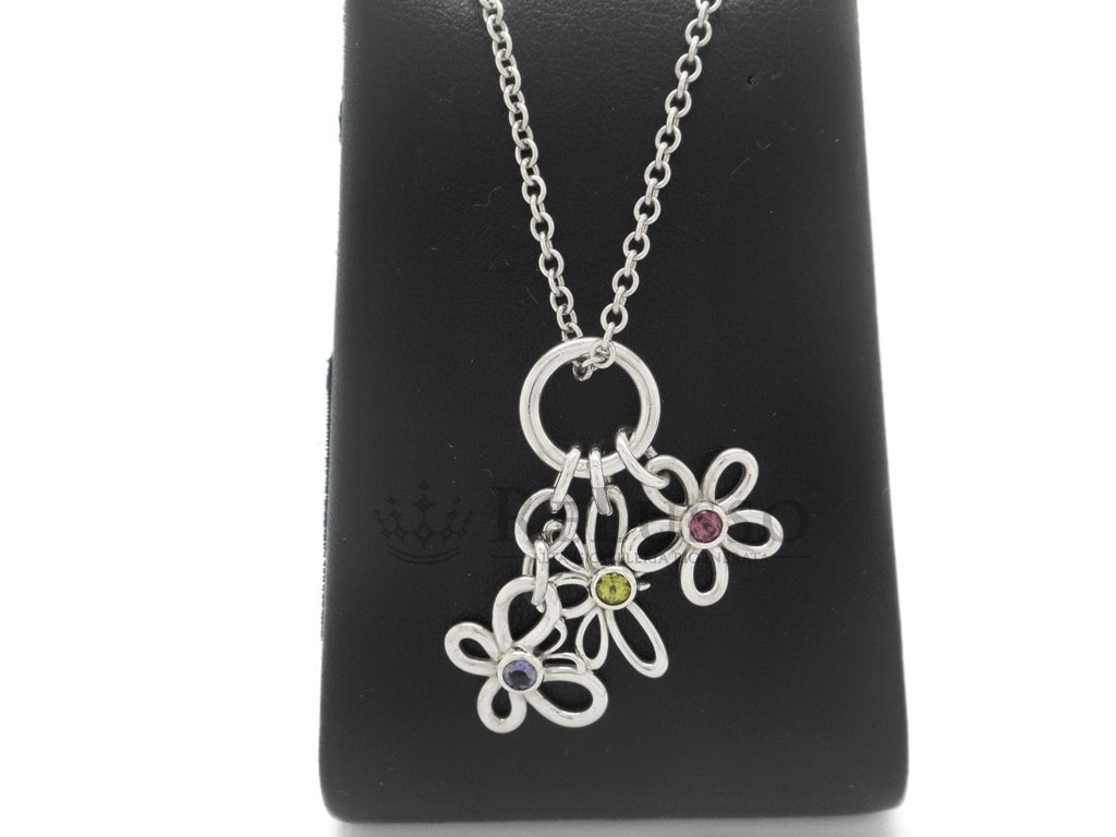 Collier Tiffany & Co. en argent sterling 925 avec un pendentif composé d’une fleur, d’une libellule et d’un papillon. Les trois pendentifs sont agrémentés d’une pierre précieuse, Saphir rose pour la fleur, péridot pour la libellule et iolite pour le papillon.