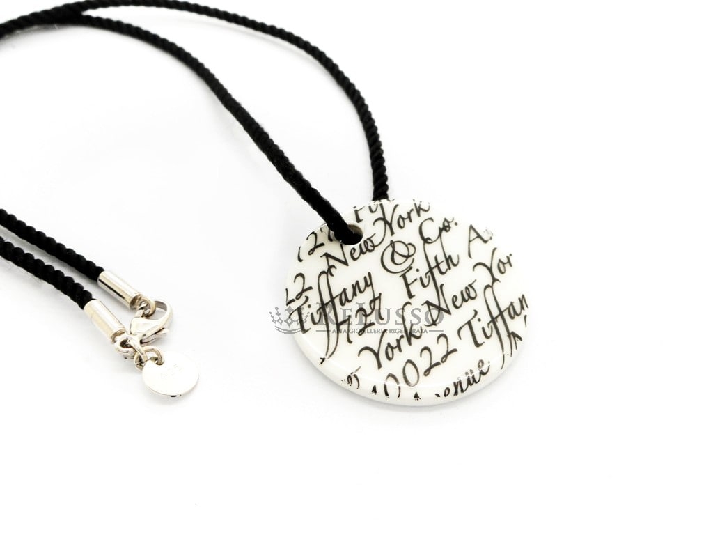 Collier Tiffany & co 39cm de long (réglable) avec cordon noir et fermoir en argent sterling 925, avec charm Tiffany Notes™, En céramique blanche. Diamètre du pendentif 3.00cm