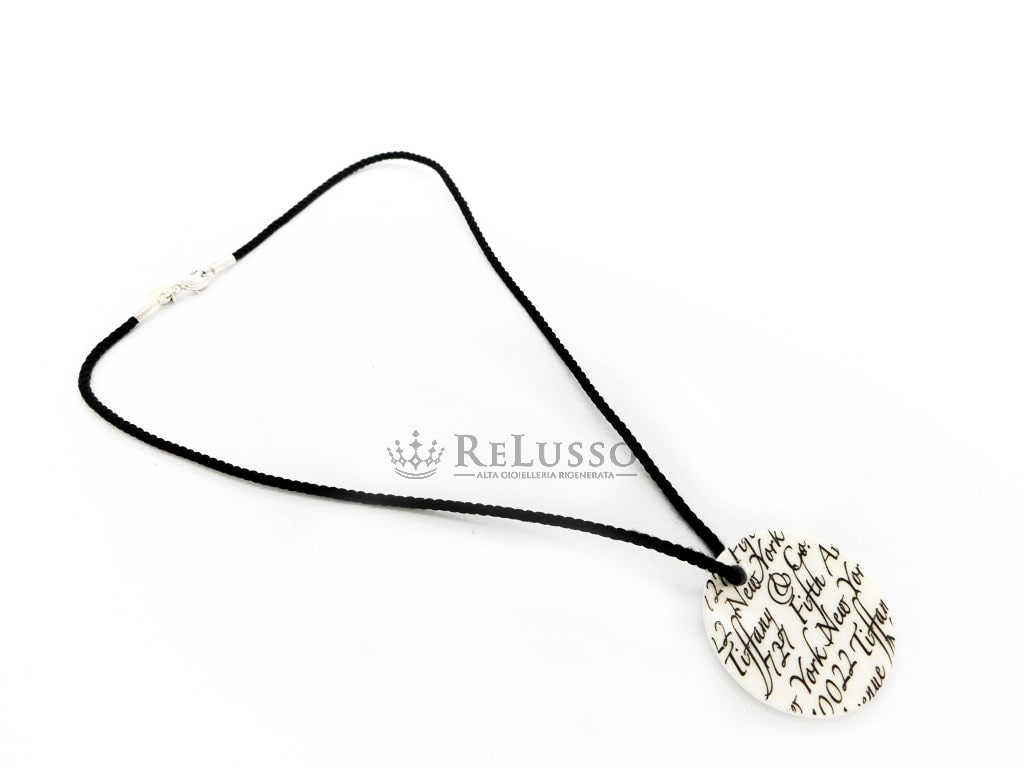 Collier Tiffany & co de 39 cm de long (ajustable) avec cordon noir et fermoir en argent sterling 925, avec pendentif Tiffany Notes™, en céramique blanche. Diamètre du pendentif 3.00cm