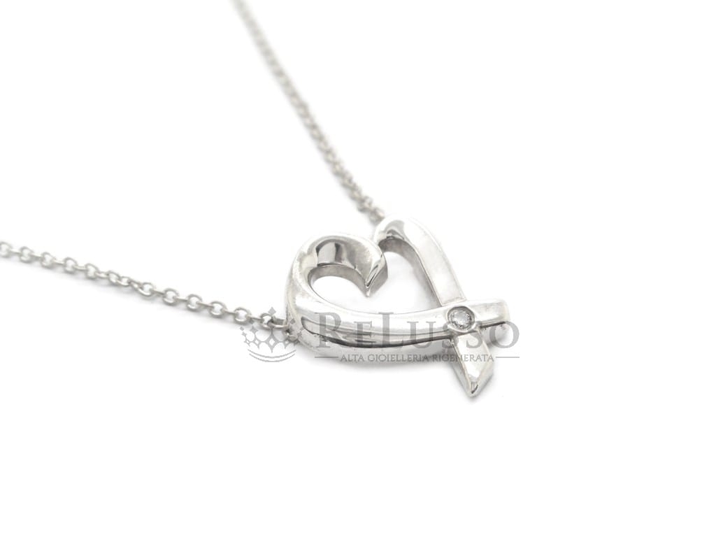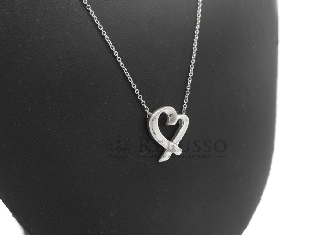 Tiffany & co, modèle Loving Heart de la collection Paloma Picasso® en argent sterling 925 avec un diamant de 0,01 ct. Le collier mesure 42,50 cm de long.