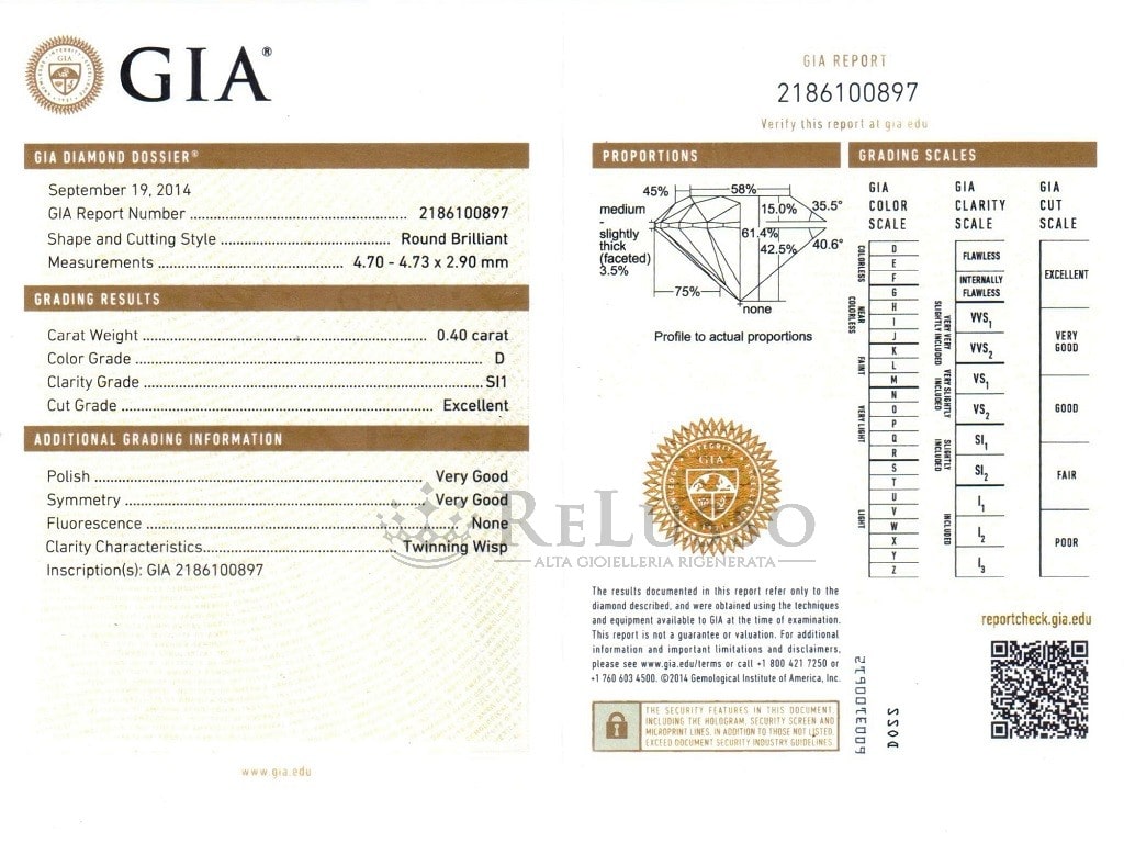 En accomplissement des devoirs d’exactitude et de transparence, la Gioielleria ReLusso® déclare expressément qu’il NE PAS détenir le statut de revendeur officiel de diamants certifiés GIA (Gemological Institute of America) et qu’il n’entretient pas de relations commerciales directes avec la société propriétaire de la marque. Tous les diamants cloqués exposés sont d’origine privée, inspectés et certifiés par des gemmologues réputés et représentent leur opinion professionnelle. Les résultats des analyses effectuées par d’autres opérateurs peuvent varier selon les circonstances et les conditions dans lesquelles les échantillons seront examinés. Plus d’informations sur les avertissements peuvent être trouvées dans le rapport gemmologique joint au diamant cloqué.
