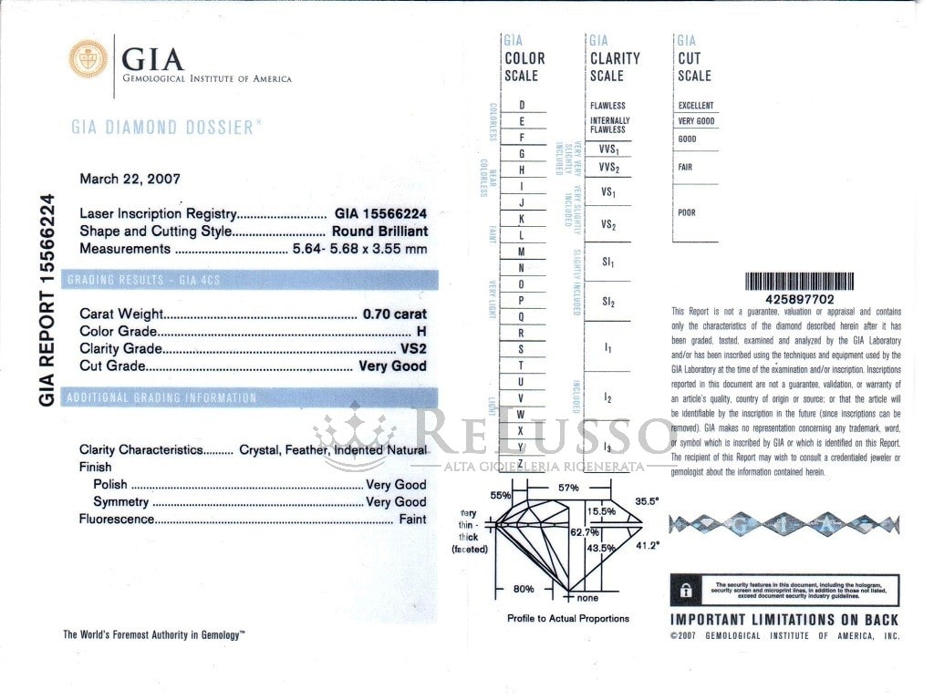 En accomplissement des devoirs d’exactitude et de transparence, la Gioielleria ReLusso® déclare expressément qu’il NE PAS détenir le statut de revendeur officiel de diamants certifiés GIA (Gemological Institute of America) et qu’il n’entretient pas de relations commerciales directes avec la société propriétaire de la marque. Tous les diamants cloqués exposés sont d’origine privée, inspectés et certifiés par des gemmologues réputés et représentent leur opinion professionnelle. Les résultats des analyses effectuées par d’autres opérateurs peuvent varier selon les circonstances et les conditions dans lesquelles les échantillons seront examinés. Plus d’informations sur les avertissements peuvent être trouvées dans le rapport gemmologique joint au diamant cloqué.