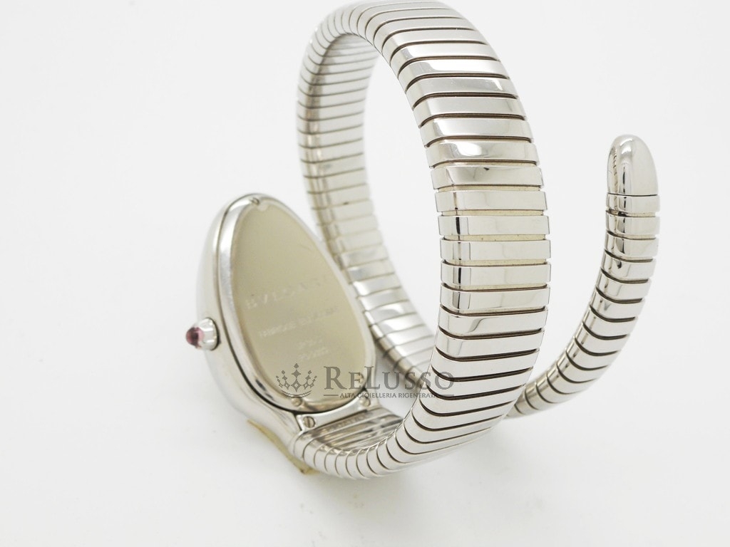 La Bulgari Tubogas Serpenti réf. Le SP35S en acier est proposé par la joaillerie ReLusso avec écrin, garantie et livret d’instructions Bulgari d’origine, révisé et garanti 1 an.