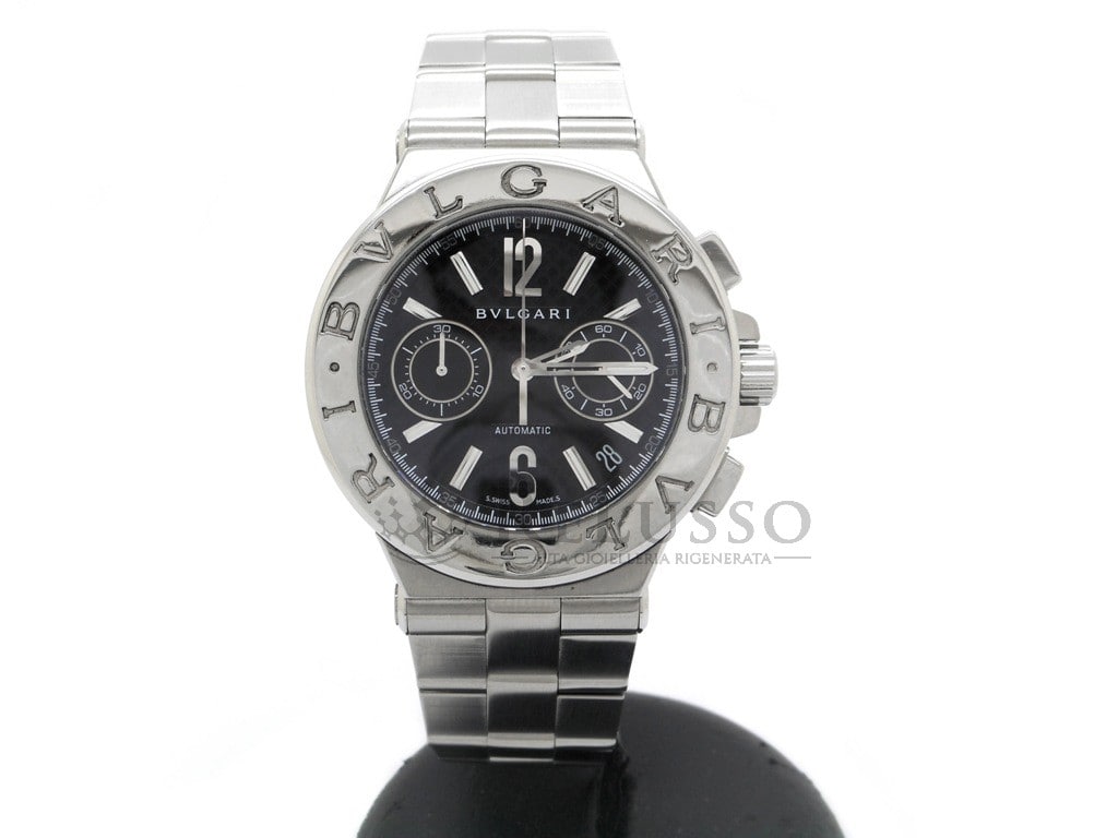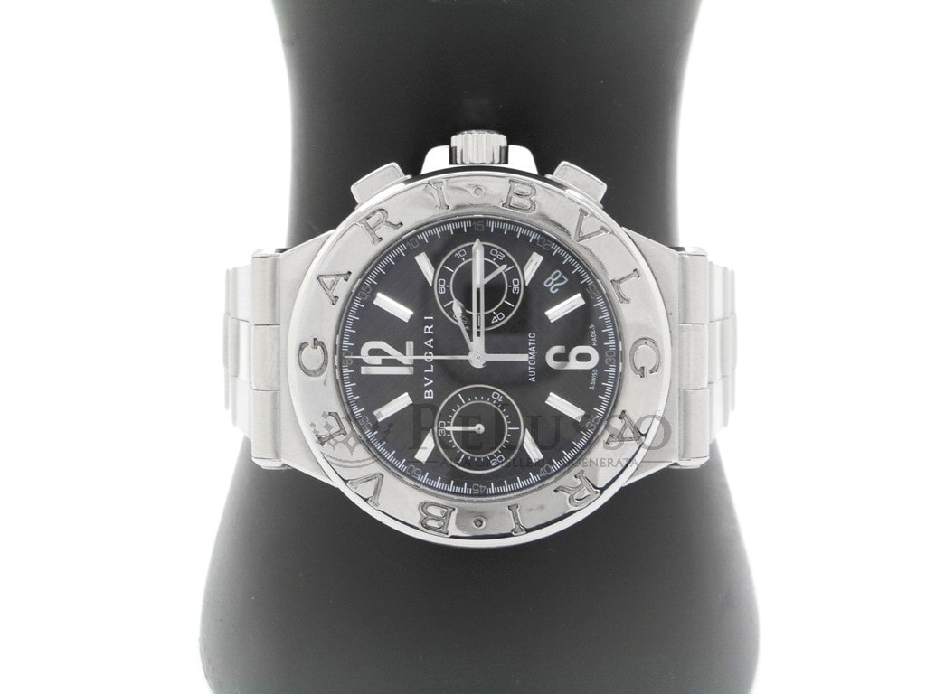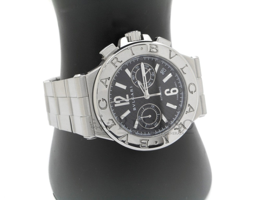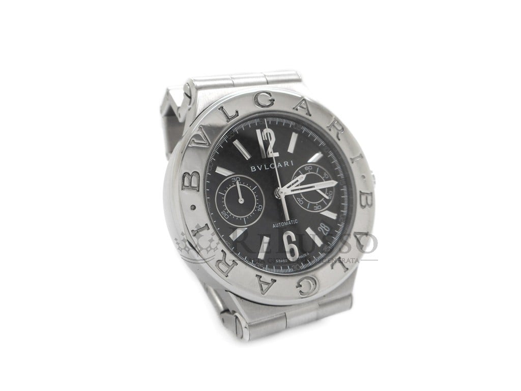 Montre chronographe Bulgari Diagono en acier référence DG 40 S CH. Cadran noir, boîtier en acier de 40 mm, mouvement automatique, bracelet en acier à double boucle déployante.