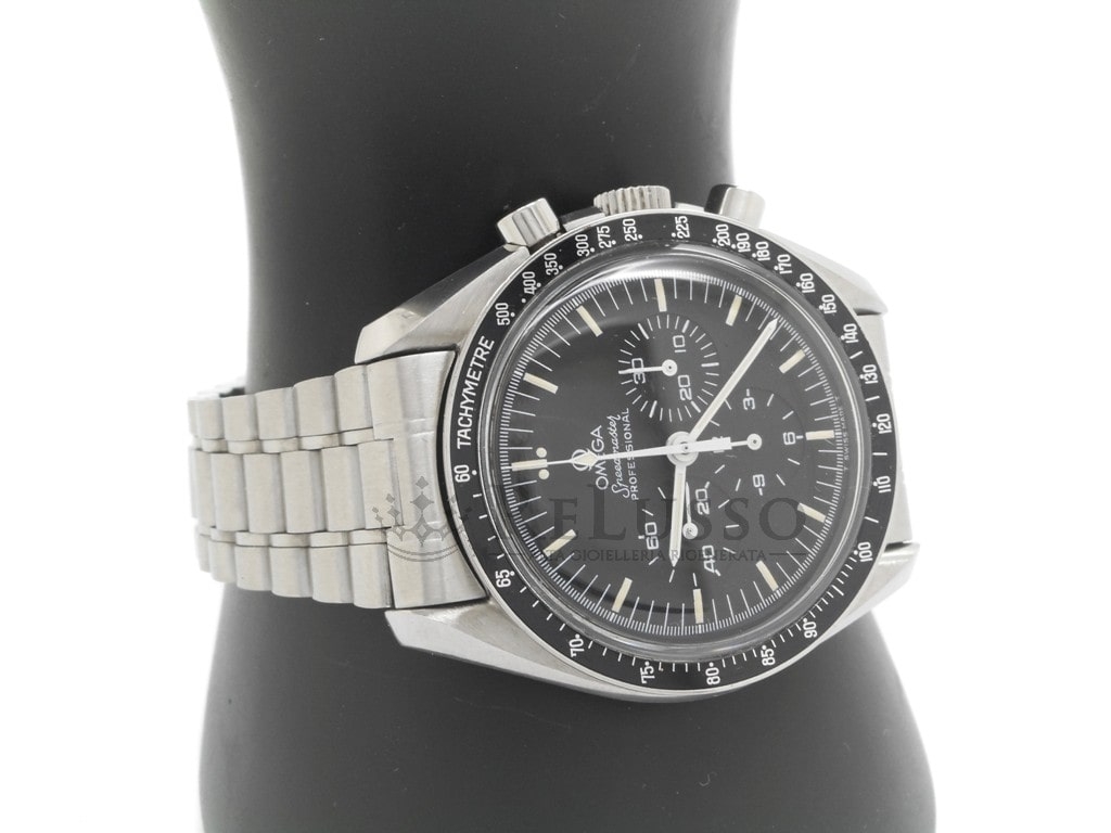 Omega Speedmaster Moonwatch en acier référence 3590.50.00. Cadran noir, lunette noire avec échelle tachymétrique, boîtier (42 mm) et bracelet en acier avec boucle déployante, mouvement à remontage manuel, verre saphir. Année 1990.