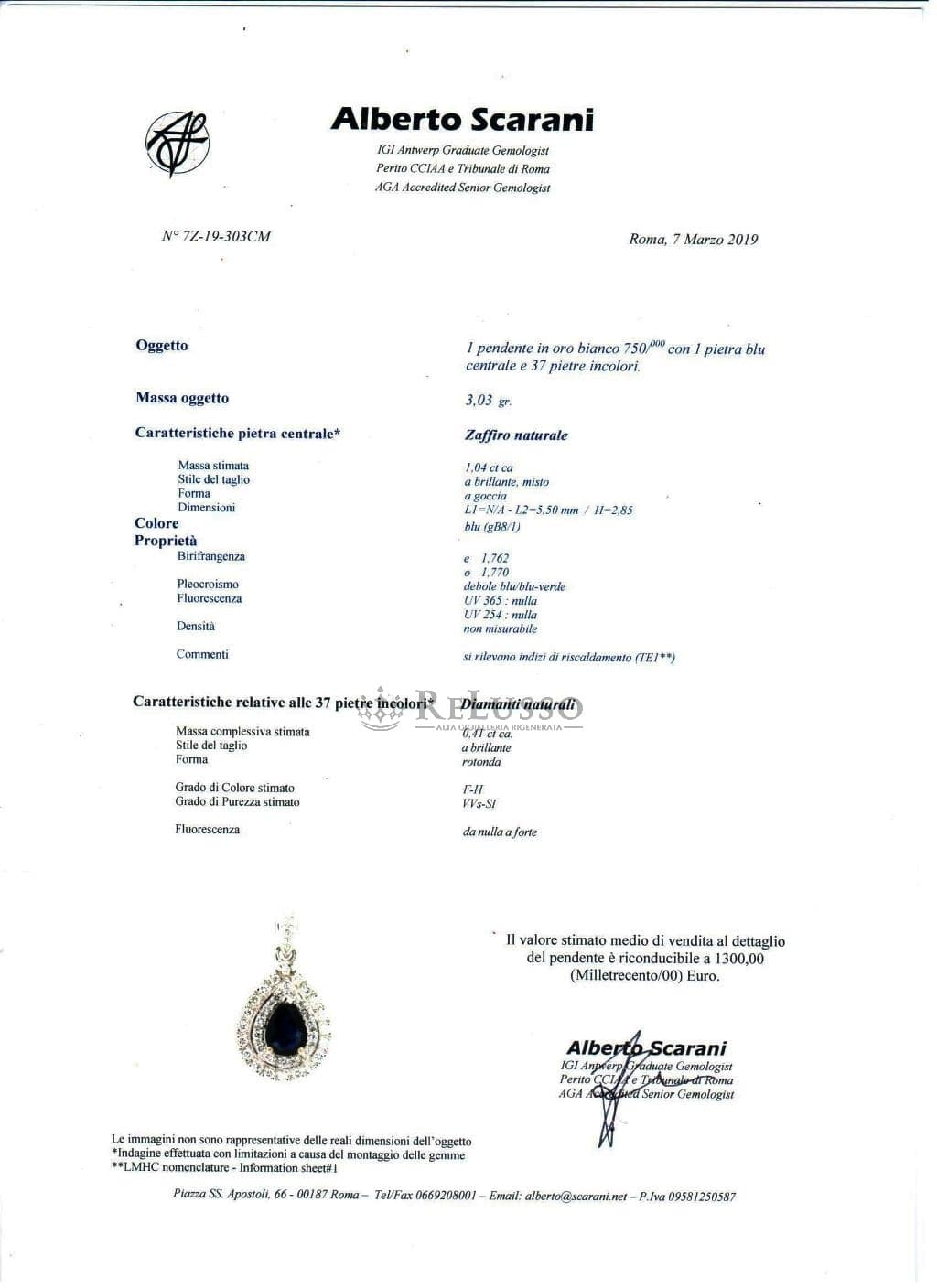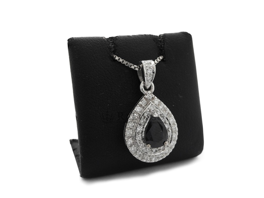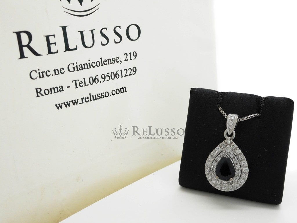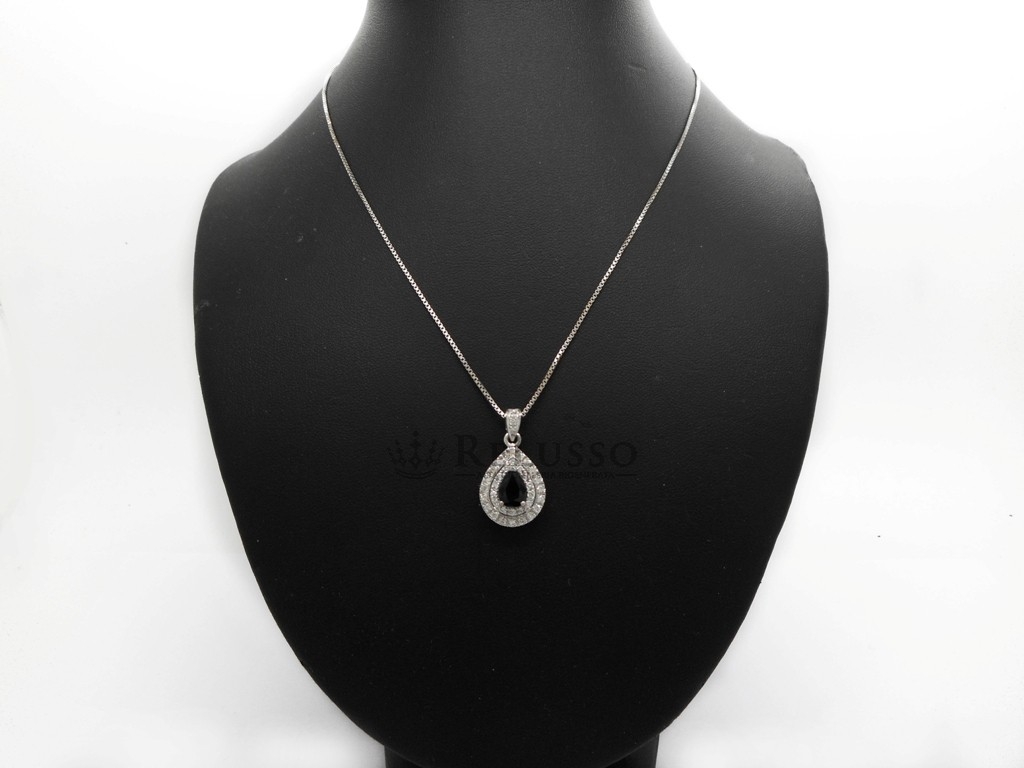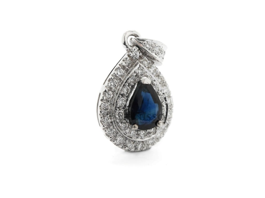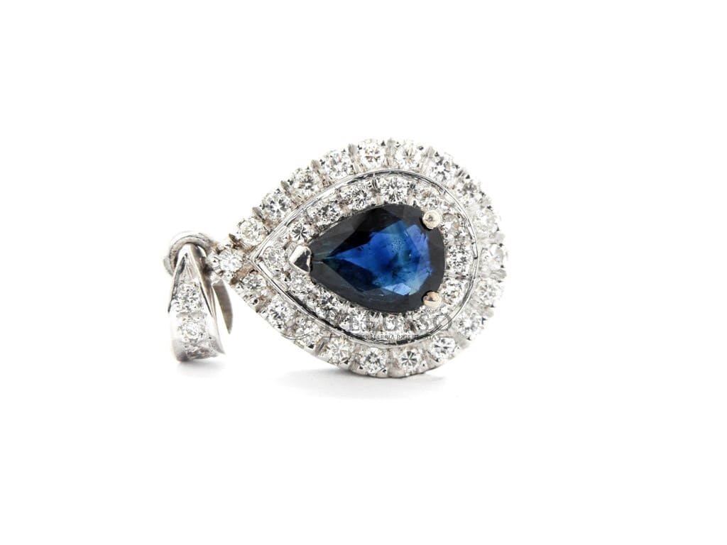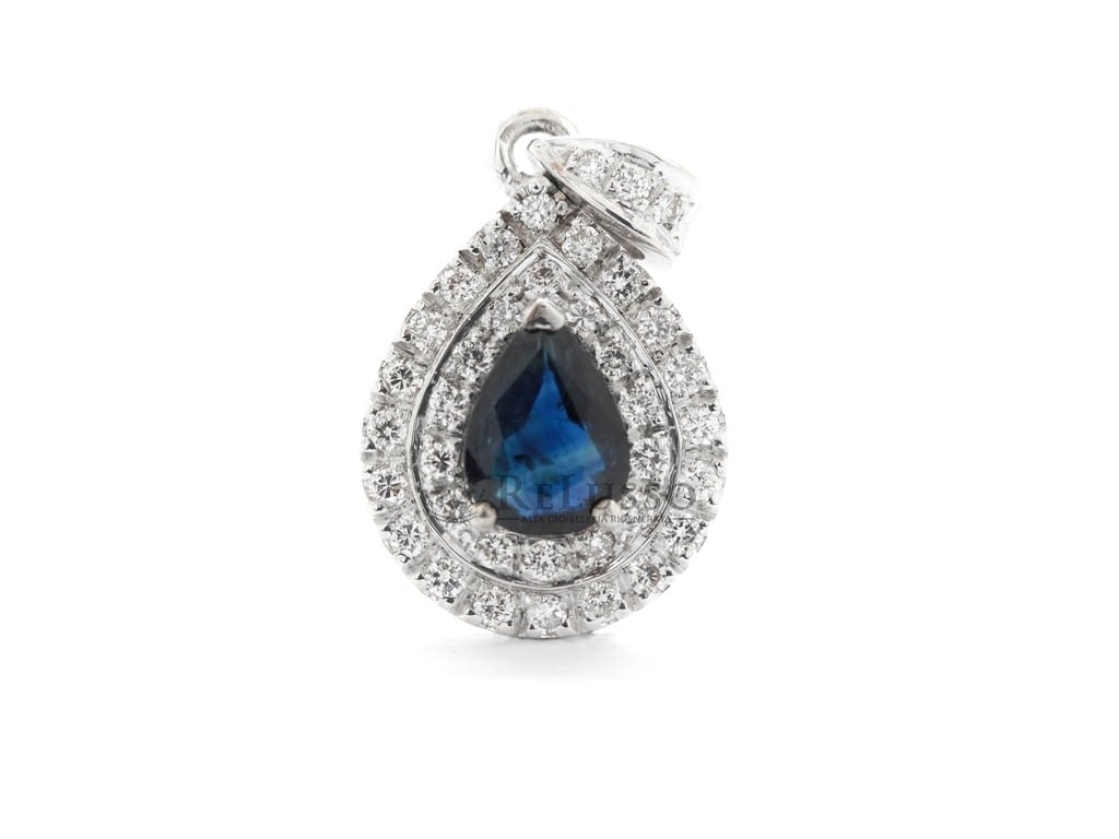 Pendentif en or blanc 18 ct avec Saphir central, taille poire, pesant 1,04 ct et pavé de diamants composé de 37 pierres pour un total de 0,41 ct de couleur F-H, pureté VVS-SI.