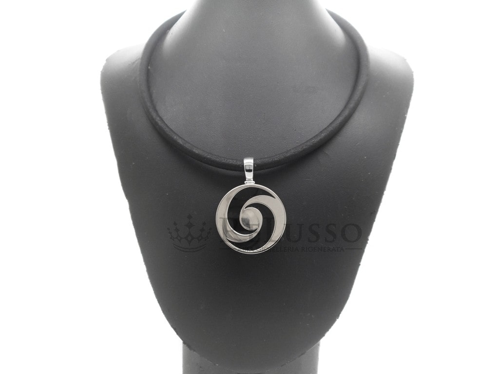 Pendentif Bulgari en or blanc 18 ct avec mécanisme rotatif en acier et onyx, de la collection Optical. La particularité du pendentif est qu’il tourne, ce qui crée un mouvement « hypnotique ». Le cordon est vendu séparément.