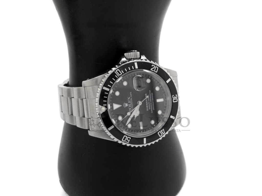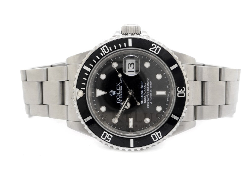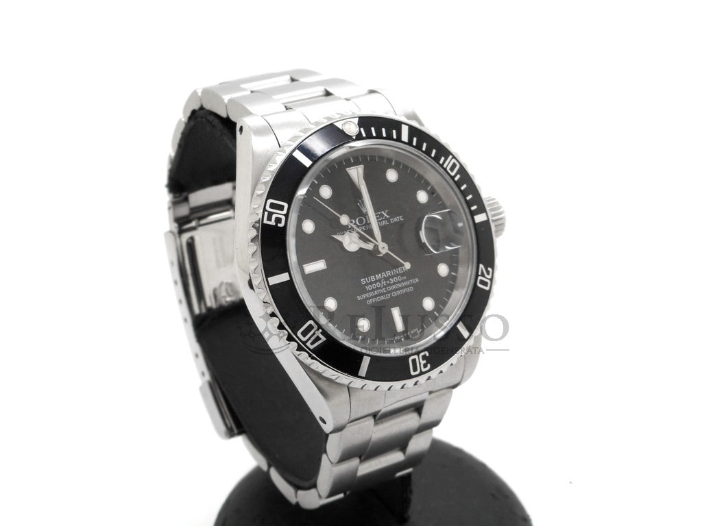 Rolex Submariner Date réf. 16610, cadran noir, boîtier en acier inoxydable de 40 mm, lunette tournante unidirectionnelle avec insert en aluminium noir, bracelet Oyster en acier inoxydable avec boucle déployante, mouvement automatique, verre saphir avec loupe Cyclope sur le guichet de la date. Année 1997.