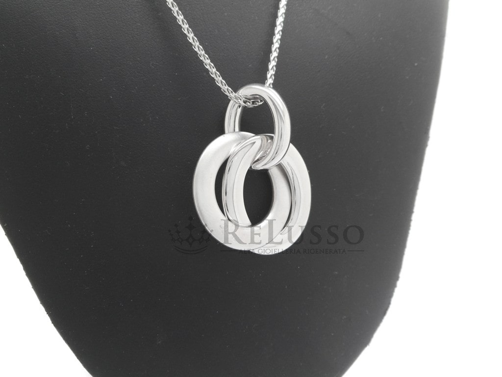 Pendente Pomellato a tre cerchi in oro bianco 18kt, di cui uno sabbiato, proveniente dalla collezione Iconica. La collana viene venduta separatamente.